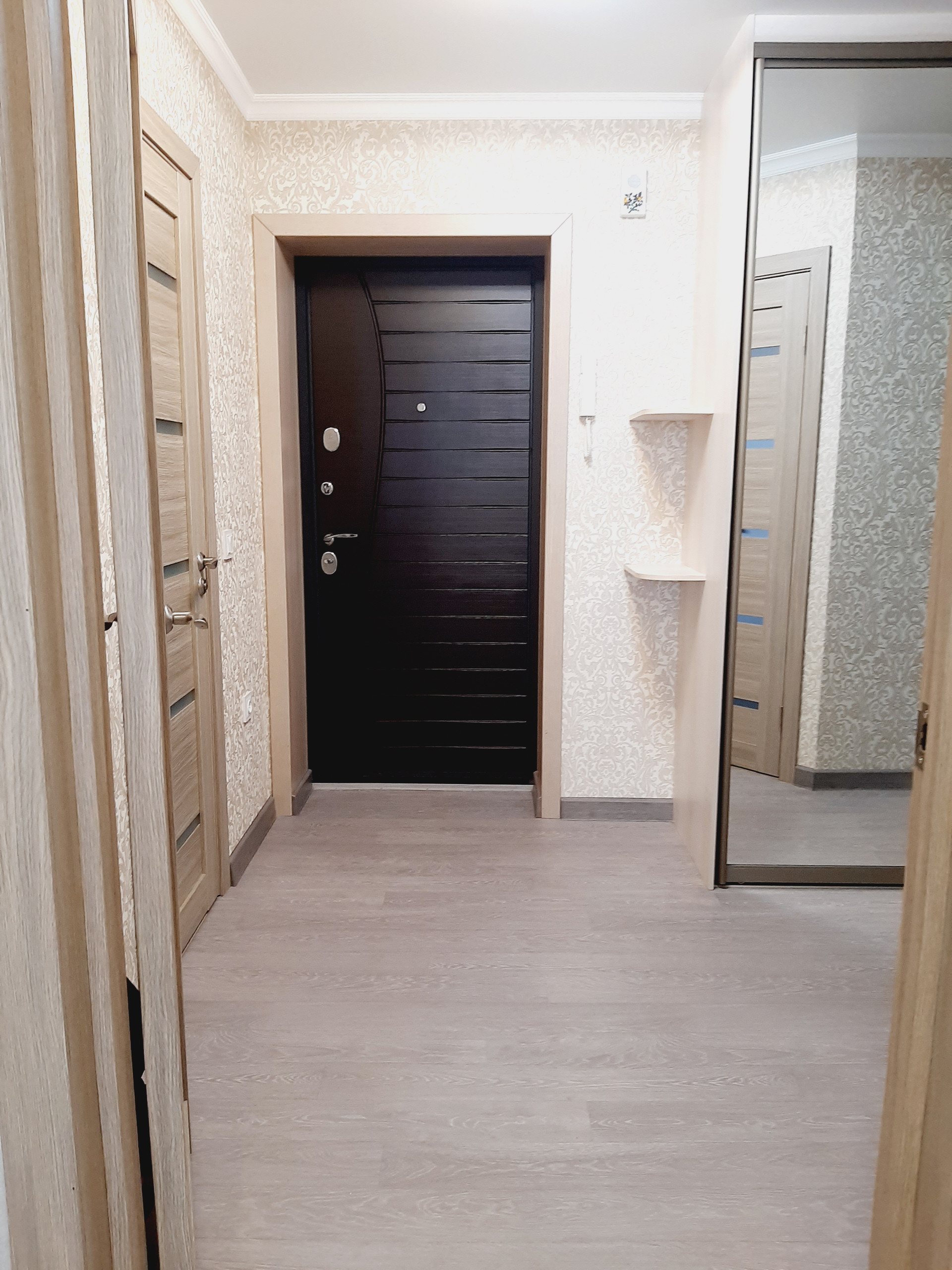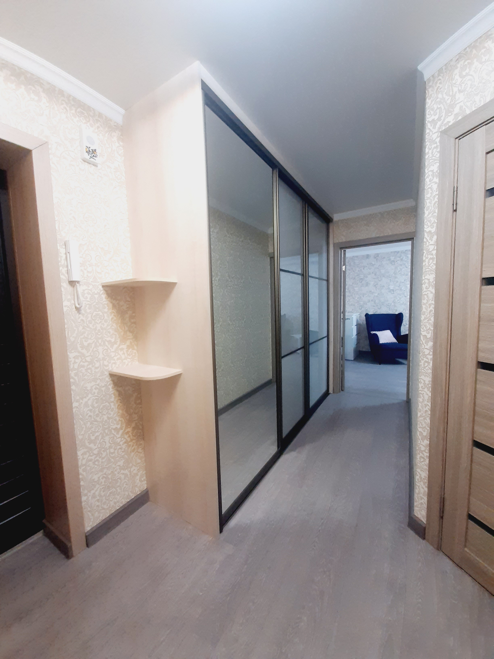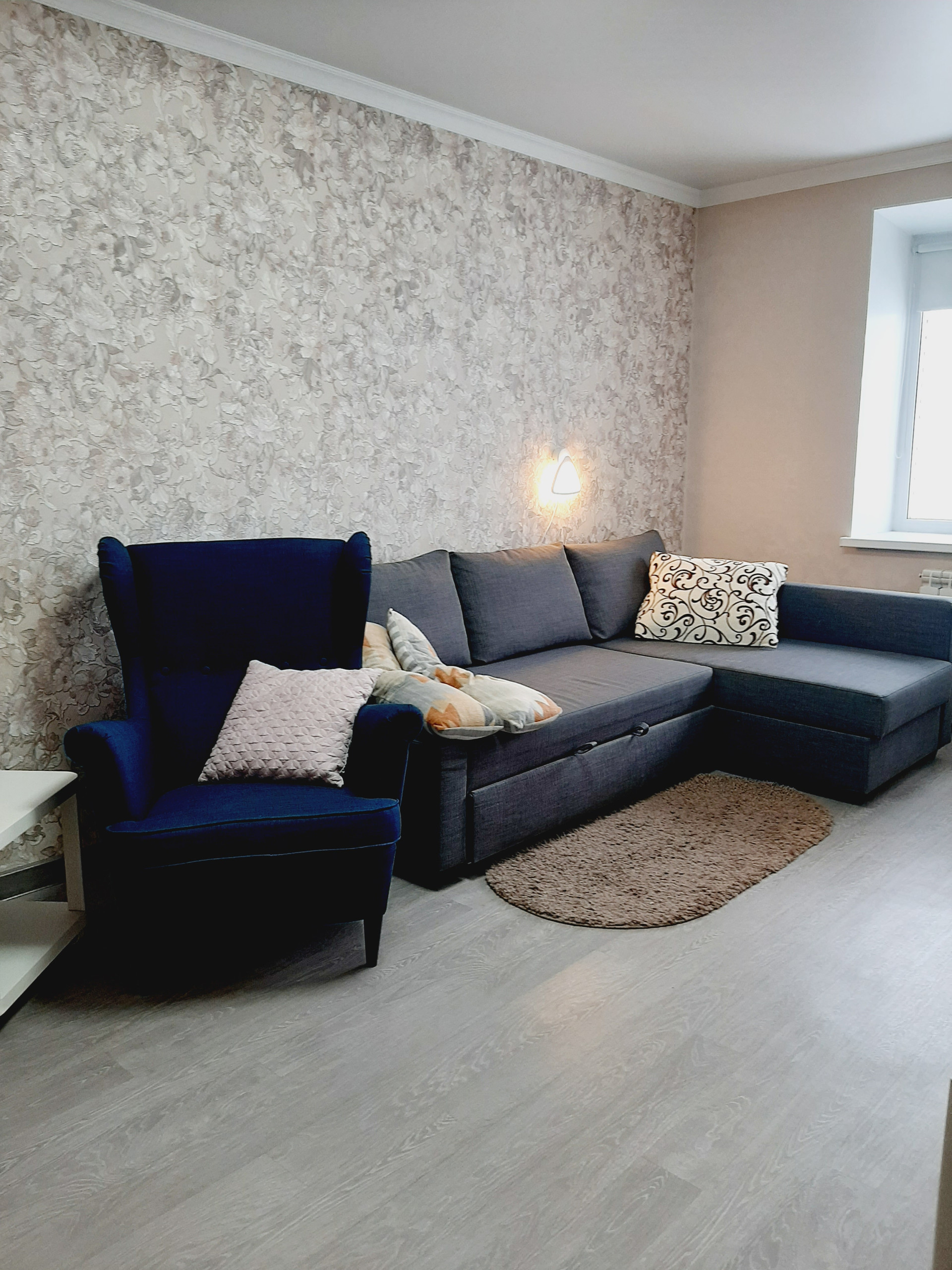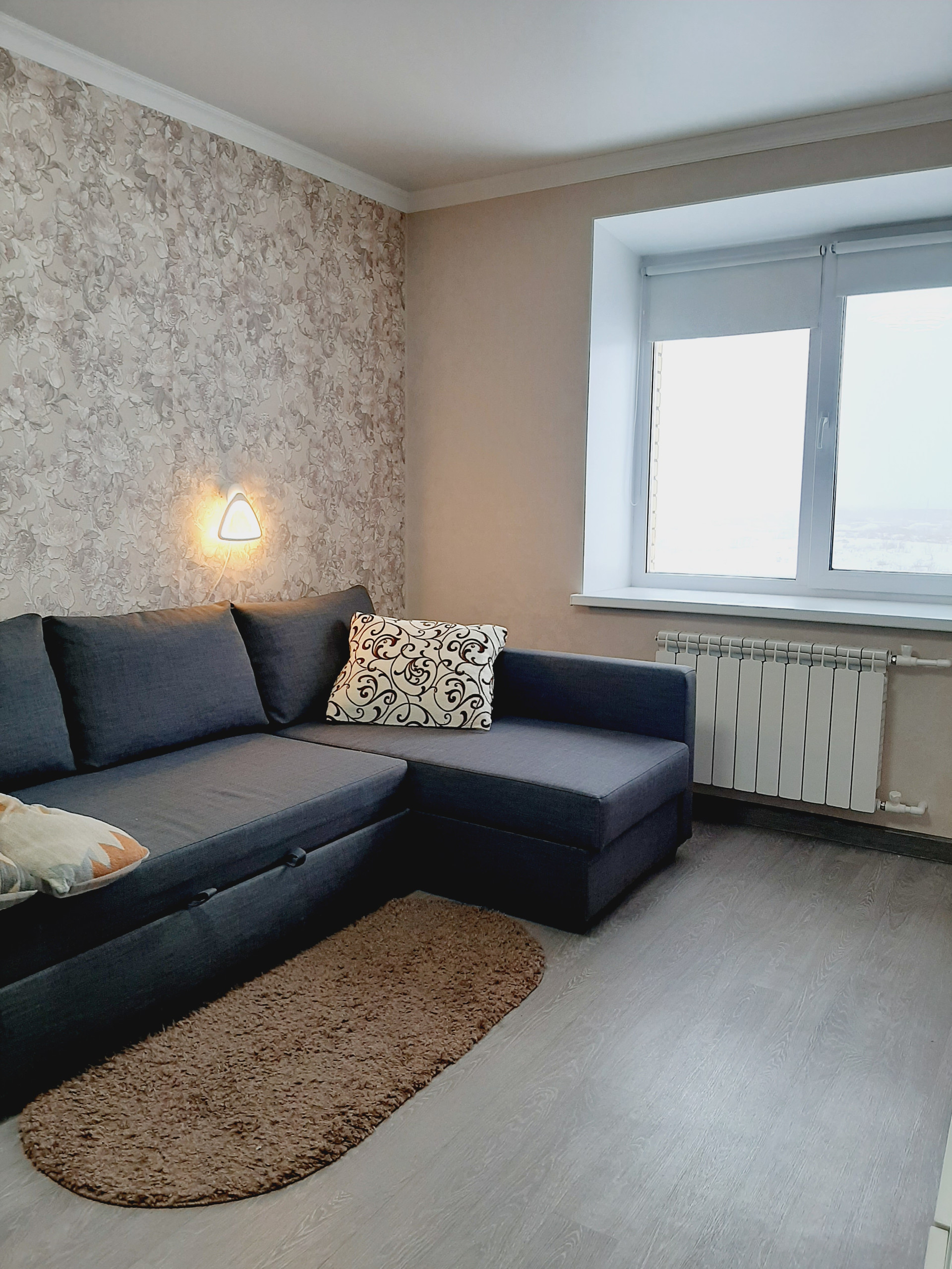 Ремонт в квартире выполнен из высококачественных материалов, хорошими мастерами: выровнены все стены и пол, выполнена разводка и установлено оптимальное количество розеток. Все обои – компаньоны, были подобраны дизайнером. На полу высококачественный промышленный линолеум – очень износостойкий. Все люстры и бра – из одной коллекции – также остаются.