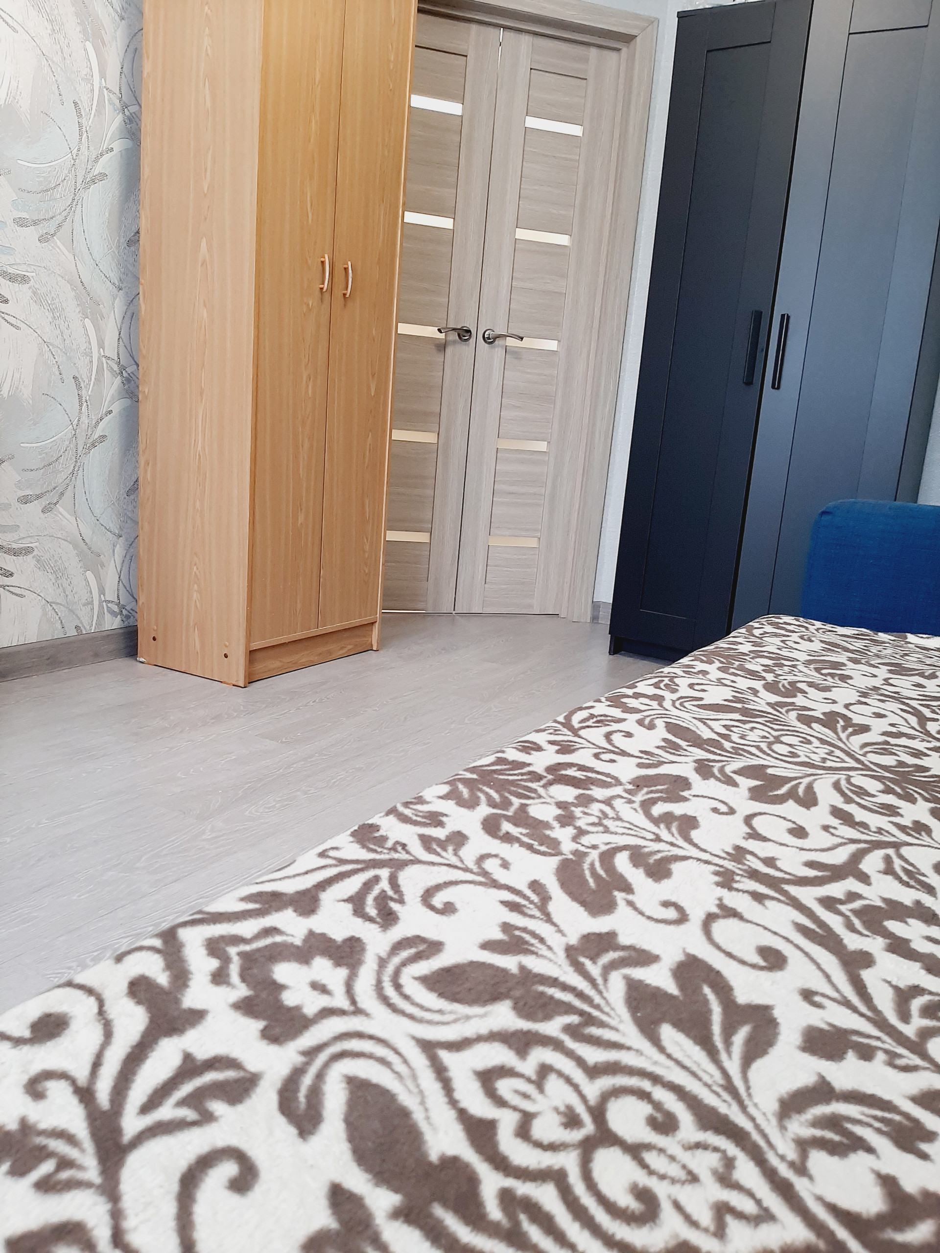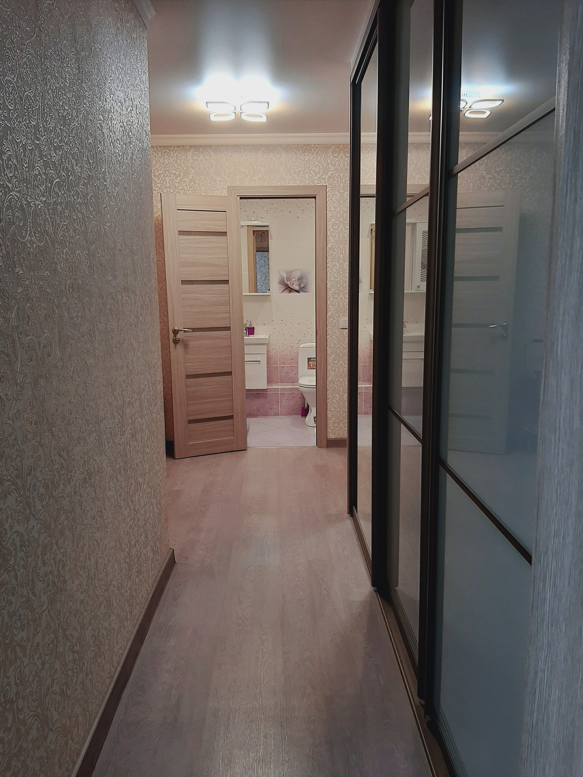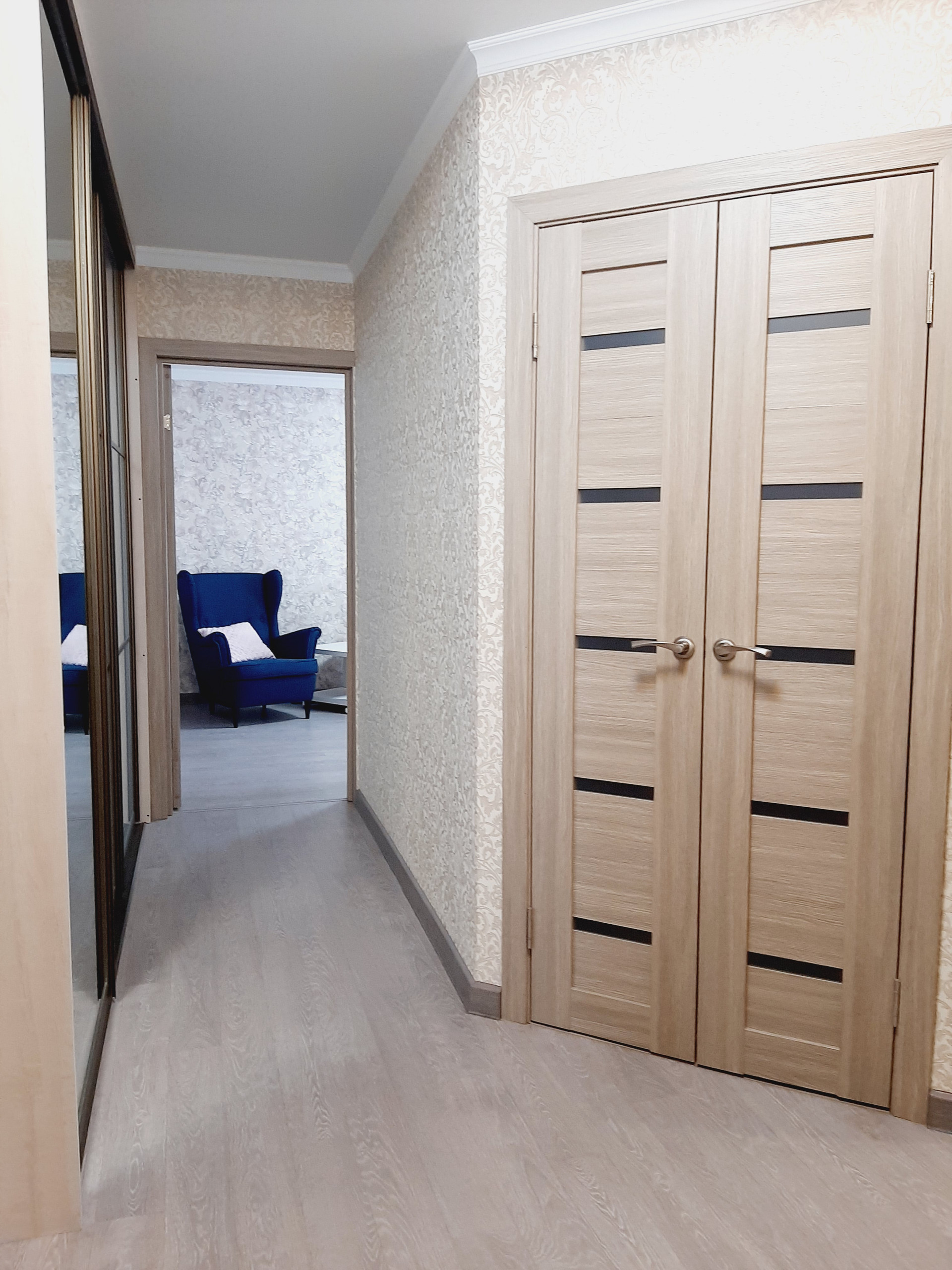 Ремонт в квартире выполнен из высококачественных материалов, хорошими мастерами: выровнены все стены и пол, выполнена разводка и установлено оптимальное количество розеток. Все обои – компаньоны, были подобраны дизайнером. На полу высококачественный промышленный линолеум – очень износостойкий. Все люстры и бра – из одной коллекции – также остаются.