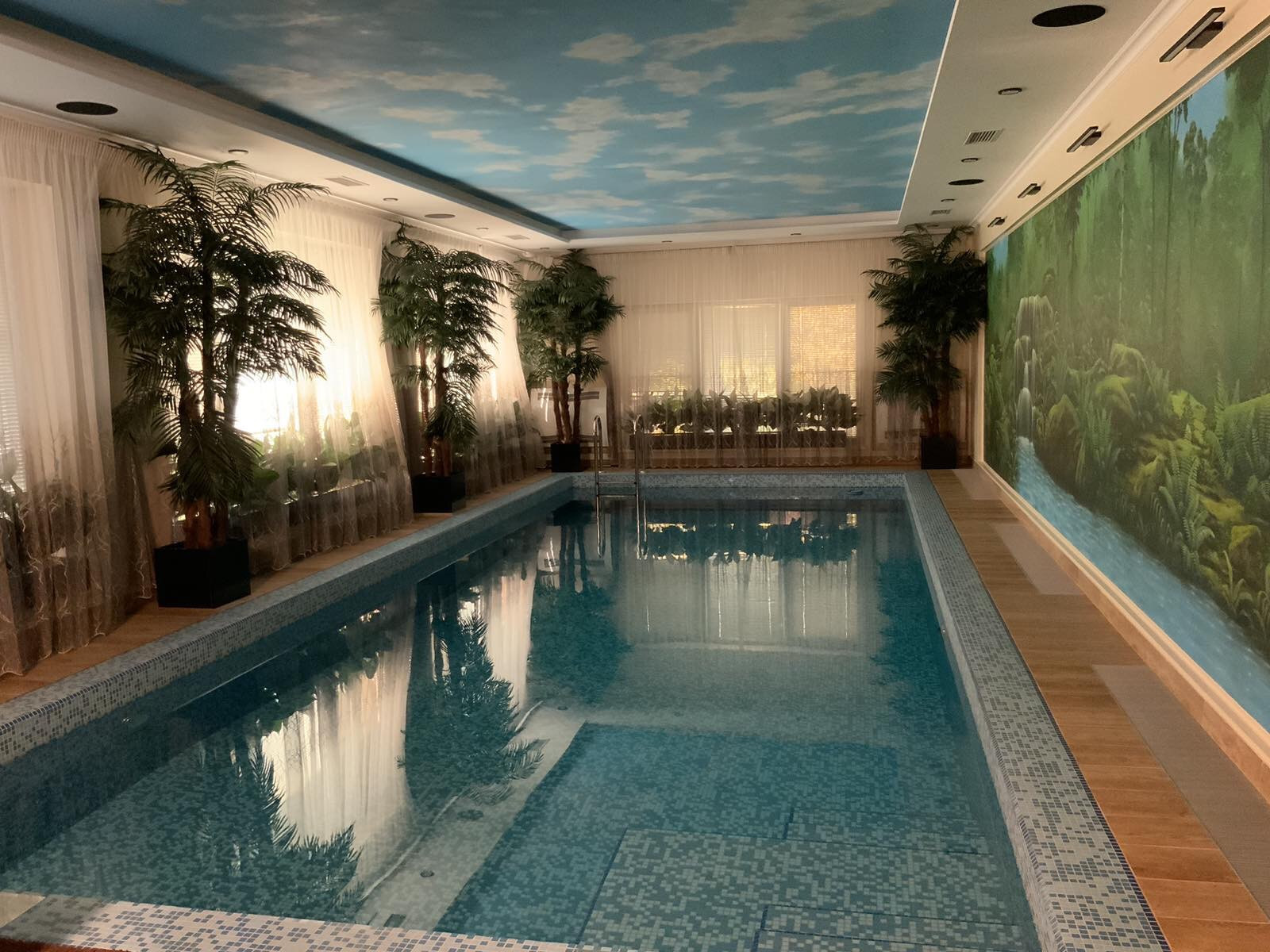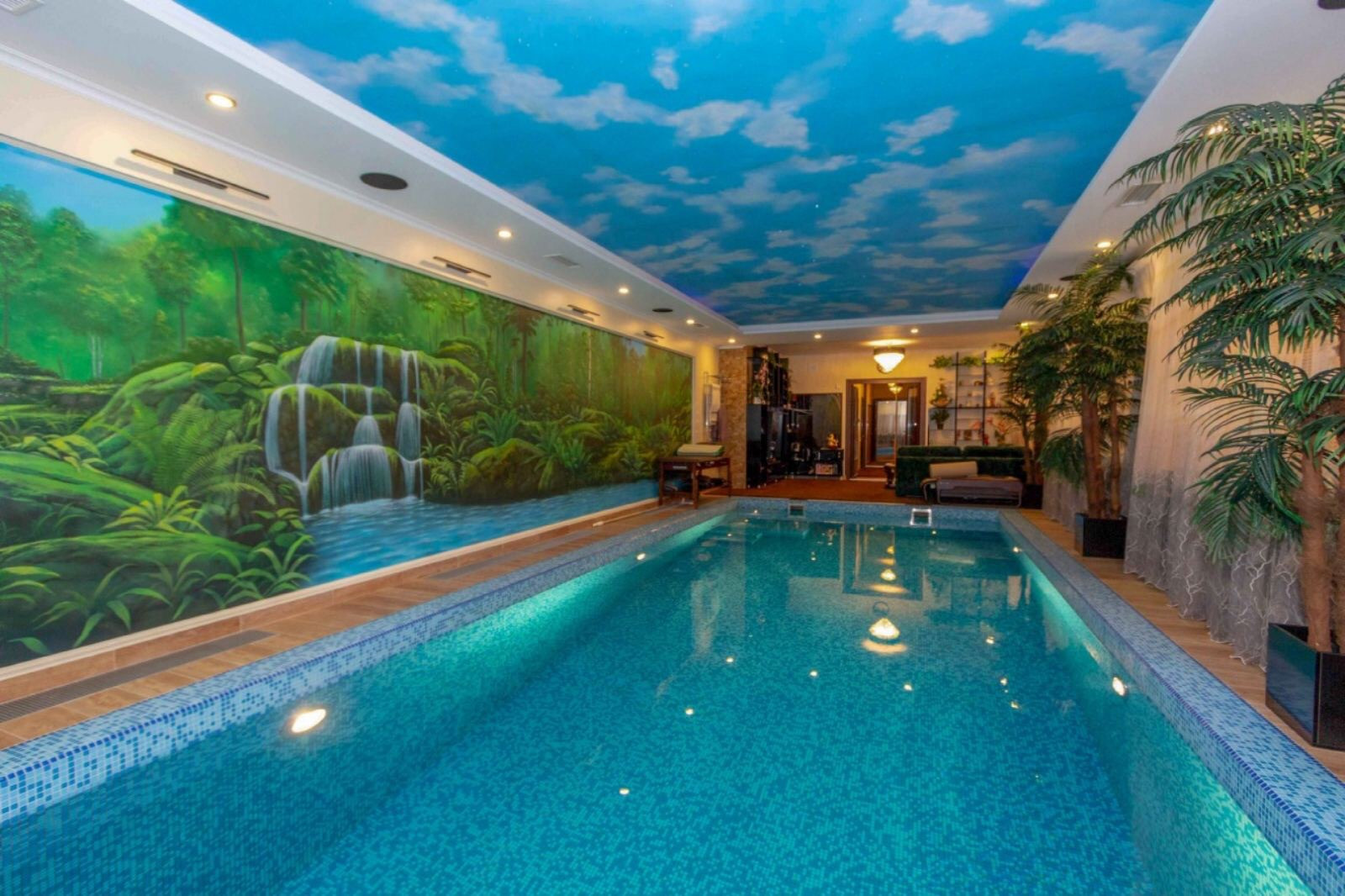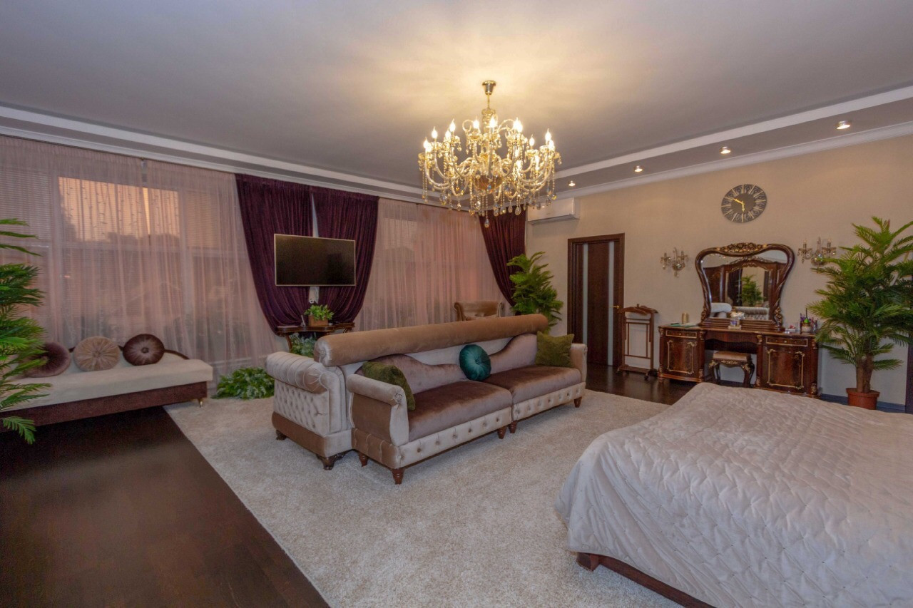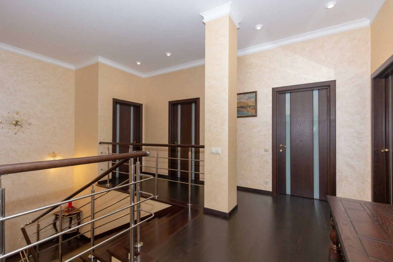 Планировка: дом: Первый этаж: прихожая, холл, гостиная совмещенная с кухонной зоной, кабинет, санузел, постирочная, котельная, бассейн, сауна, гараж. Второй этаж: 4 спальни, каждая с собственным санузлом и гардеробной. Помещение бассейна: чаша бассейна 10 метров в длину, сауна, душ.