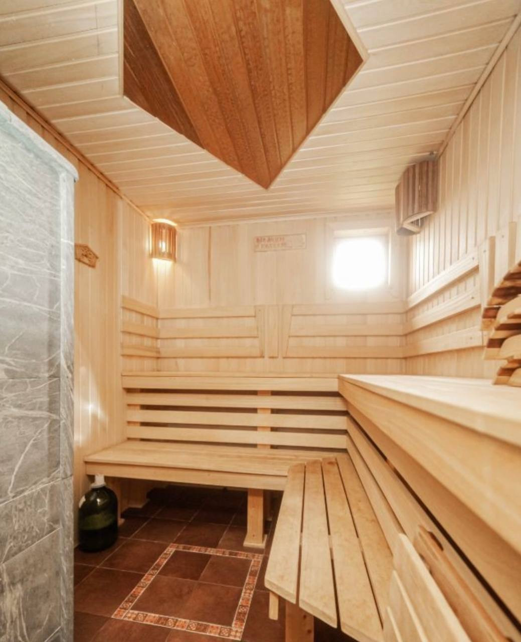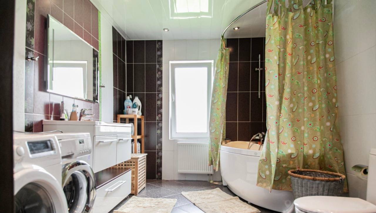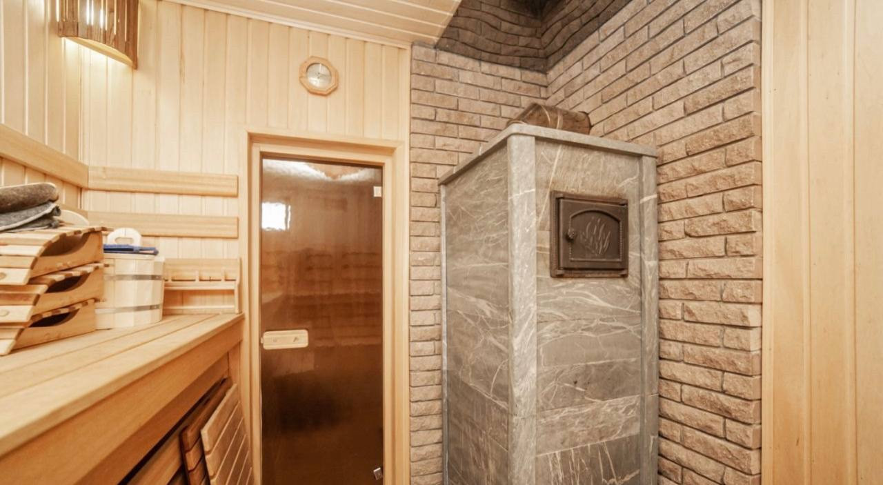 На первом этаже располагается : огромная гостиная, кухня, 2 спальни, санузел, веранда, на окнах стоят стеклопакеты, с уличной стороны закрываются роллетами. Сауна с финской печью.