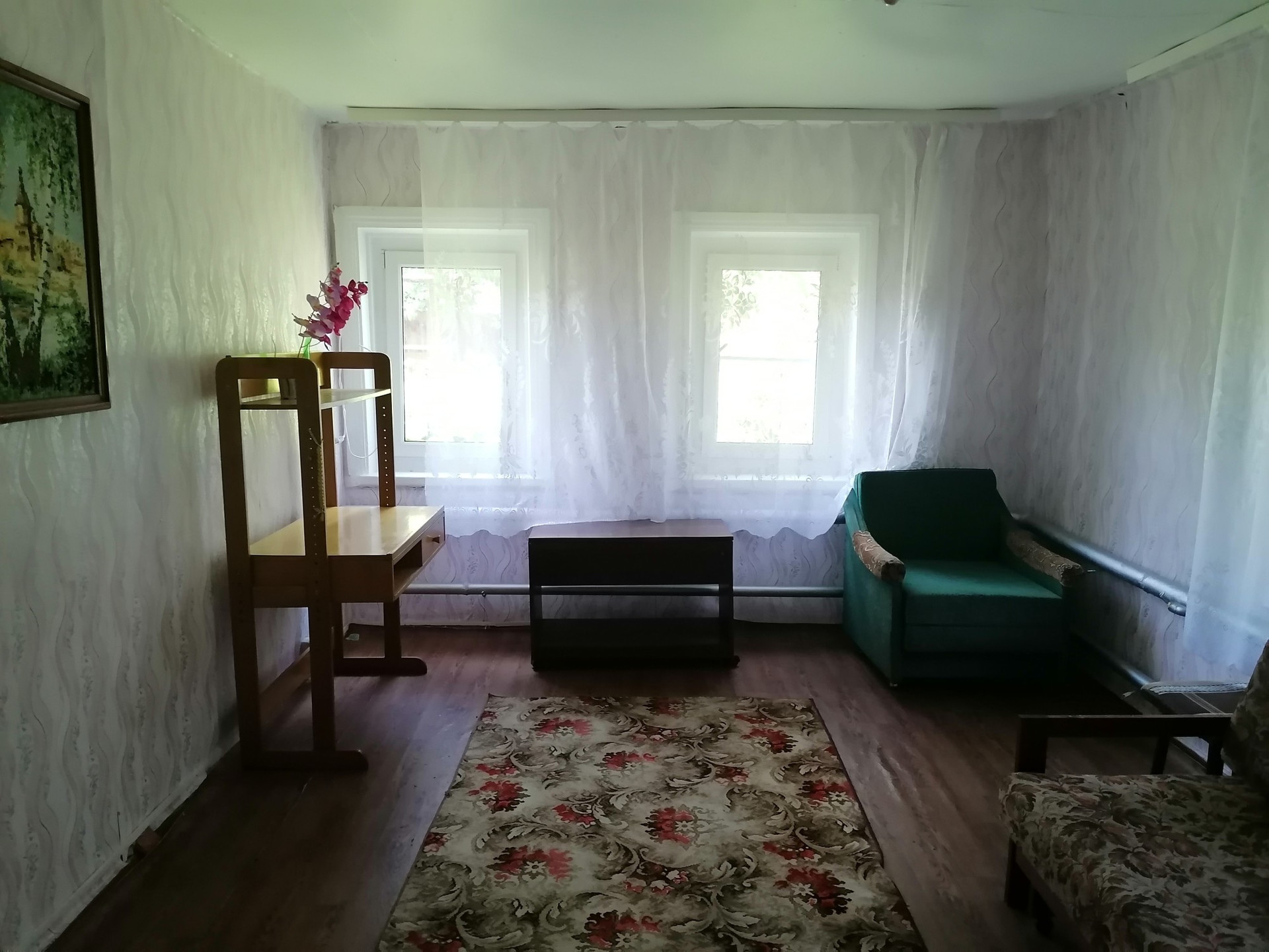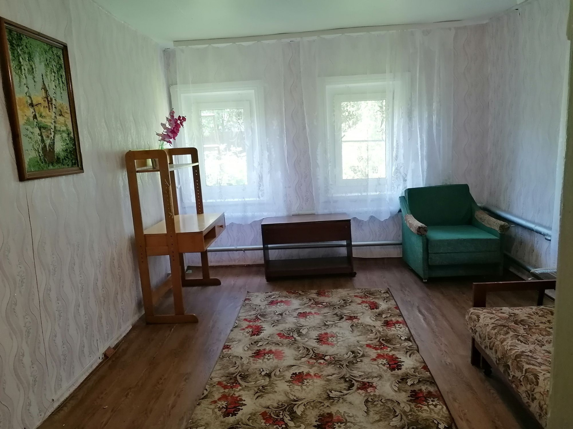 Дом частично бревенчатый, пристроены жилые комнаты из кирпича. Кухня 11 м, три спальни, гостиная, есть печь. Множество надворных построек, гараж, на весы, баня, погреб, козляк. Участок поделен на сад, где растут яблони, вишни, крыжовник, груша и огород. Земли много.