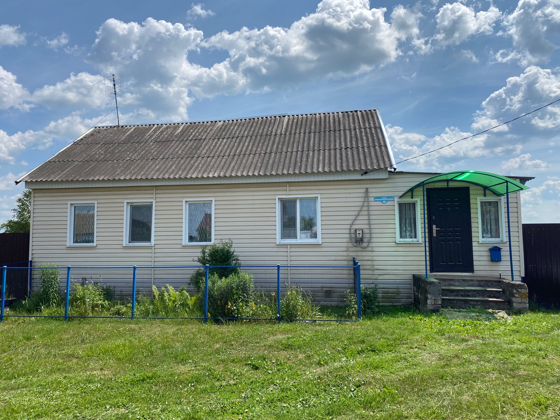 Дом бревно, обшит сайдингом, кирпичная пристройка, огорожен забором из профлиста.