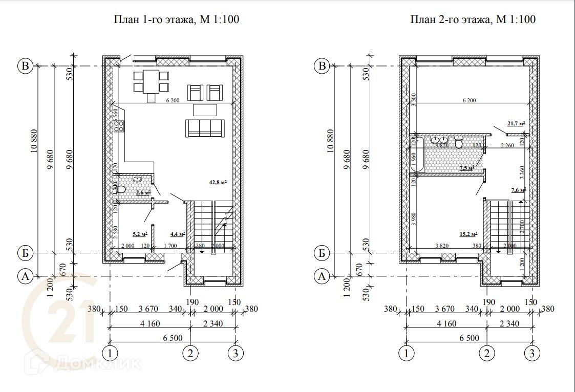 - на втором этаже располагаются две комнаты площадью 15,2 кв.м. и 21,7 кв.м., а также ванная комната с санузлом 7,5 кв.м.