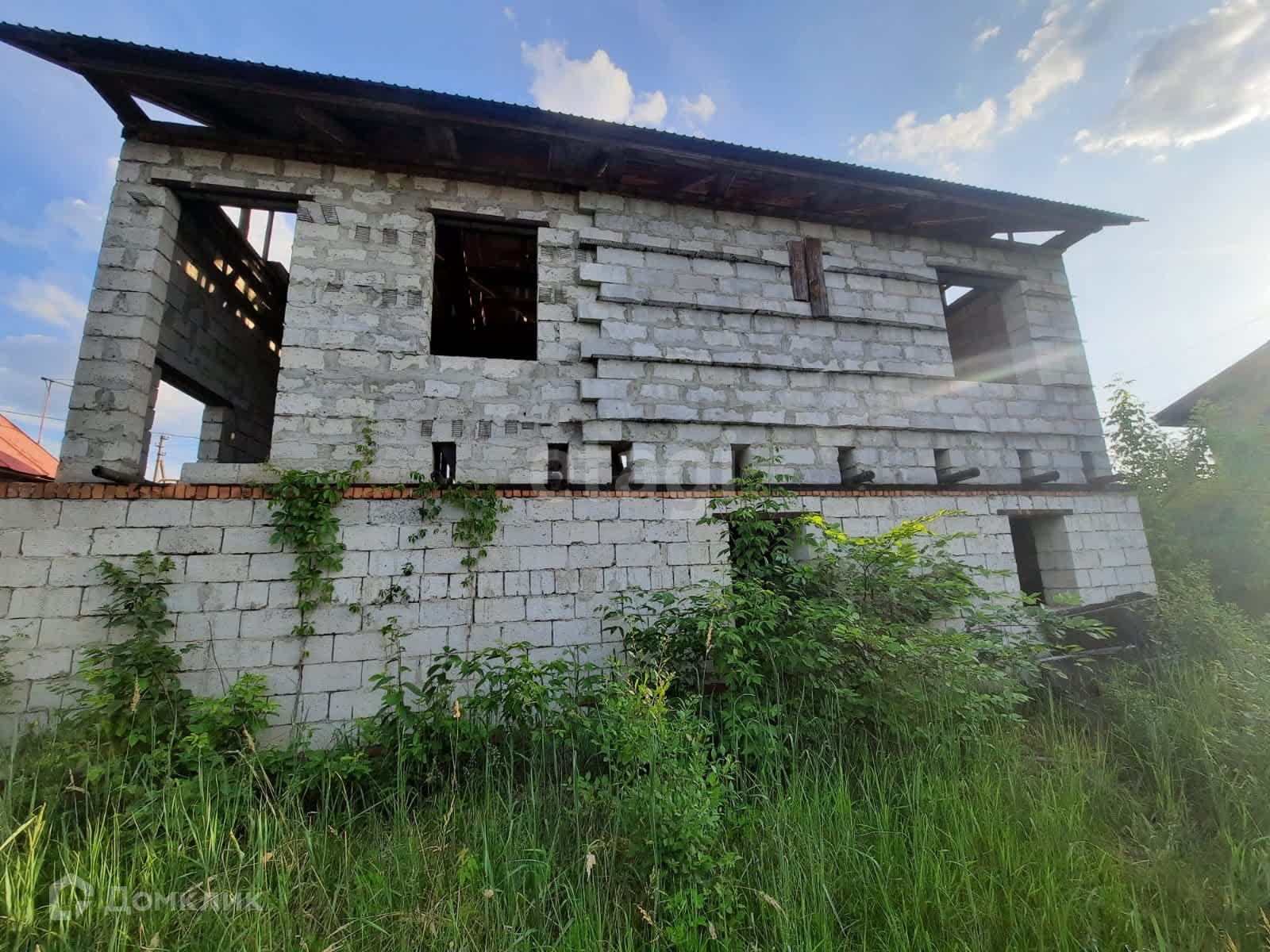 Цоколь постройки дома и первый этаж из кирпича, блоки с одной стороны, с противоположной брёвна. Так же лежат заготовленный материал брёвен для строительства.
