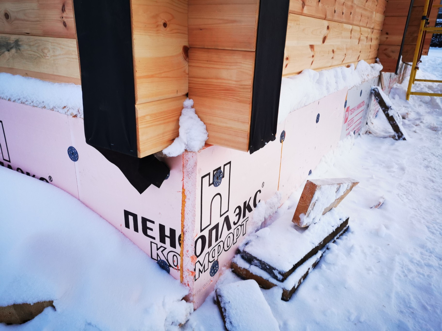 Фундаментная плита 300мм, армирование 200*200 арматура 12 в 2 ряда)поднят на 3 кирпича, утеплен снаружи пеноплексом, будет заливаться пол с утеплением. В доме предусмотрены тёплые полы.
