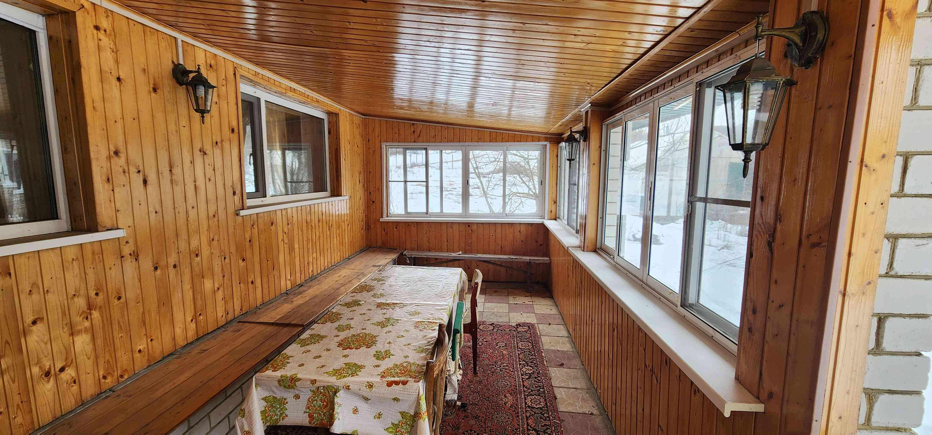 крытая большая веранда с большим деревянным столом и скамьями для семейных посиделок;