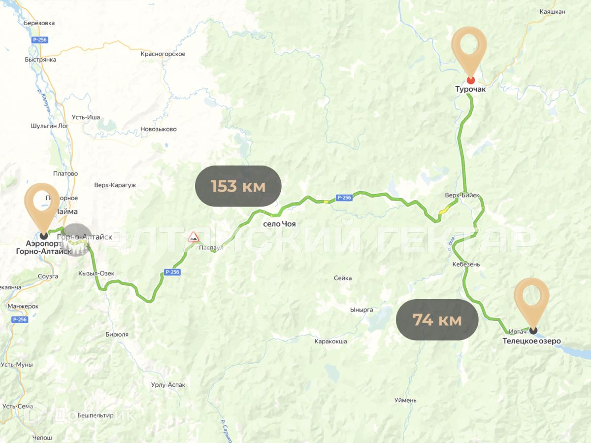 От участка до популярнейшего Телецкого озера около 64 км. Около 140 км по новой реконструированной трассе до аэропорта Горно-Алтайска.