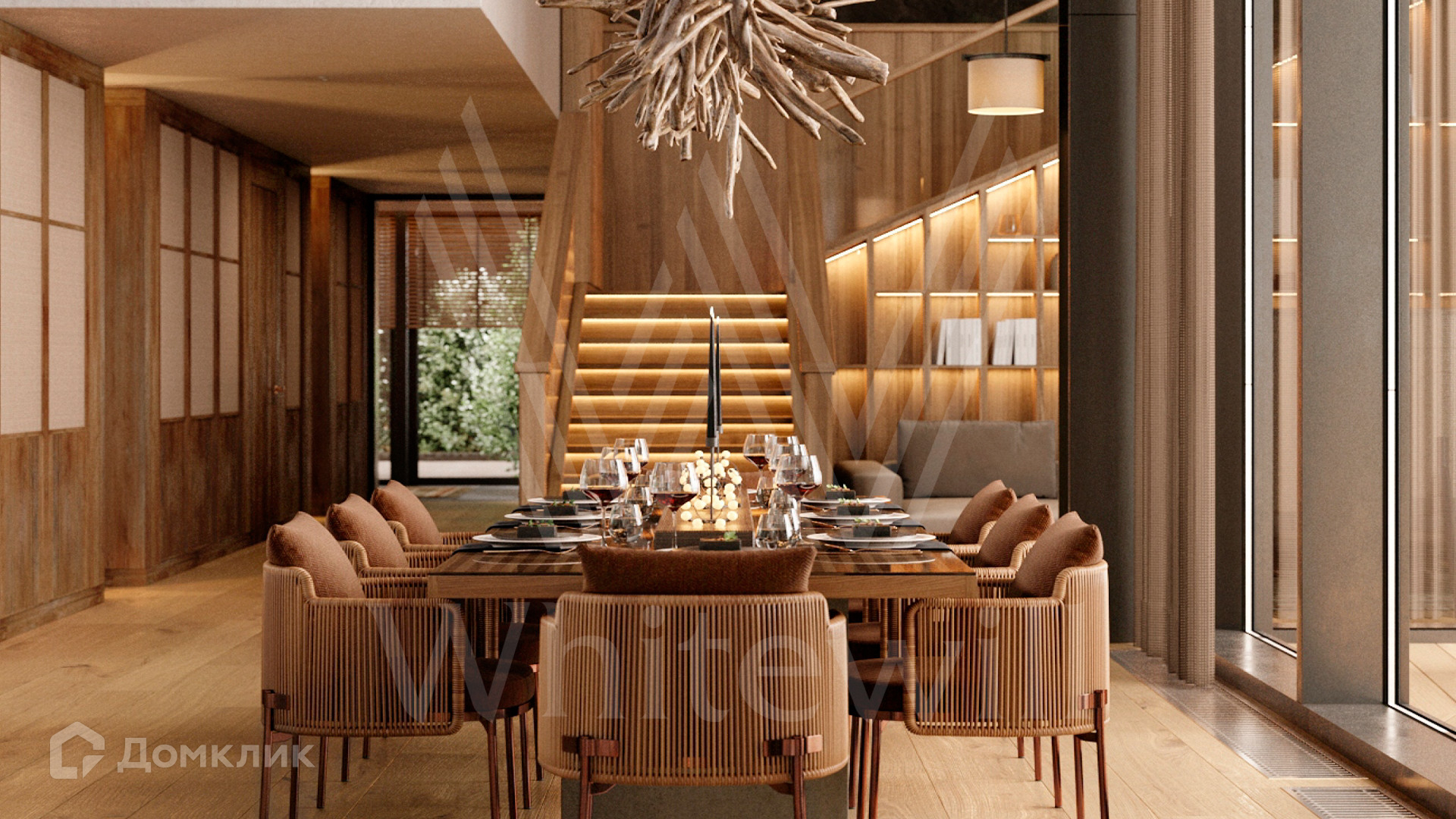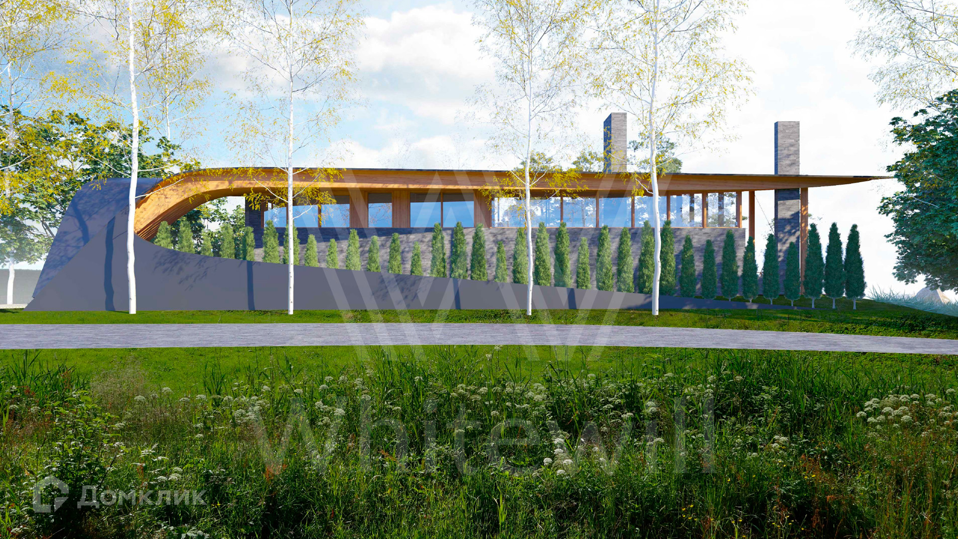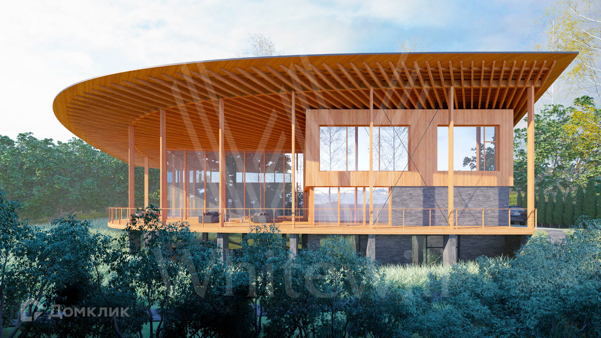 ID 12 649. Уборы. Загородный дом без отделки площадью 700 м² расположен на полевом участке 25 соток рядом с водоемом. Архитектура с плавными линиями гармонично вписывается в природный ландшафт. Фасад облицован деревом и клинкерной плиткой. Из панорамных окон открывается вид на водную гладь и сосновый лес. В коттедже спланировали 4 спальни, гостиную с камином и вторым светом, кухню-столовую, кабинет, винный погреб, спортзал и сауну. Предусмотрены гараж на 2 машины и комната персонала. На участке можно высадить деревья и кустарники, оборудовать бассейн и зоны отдыха.