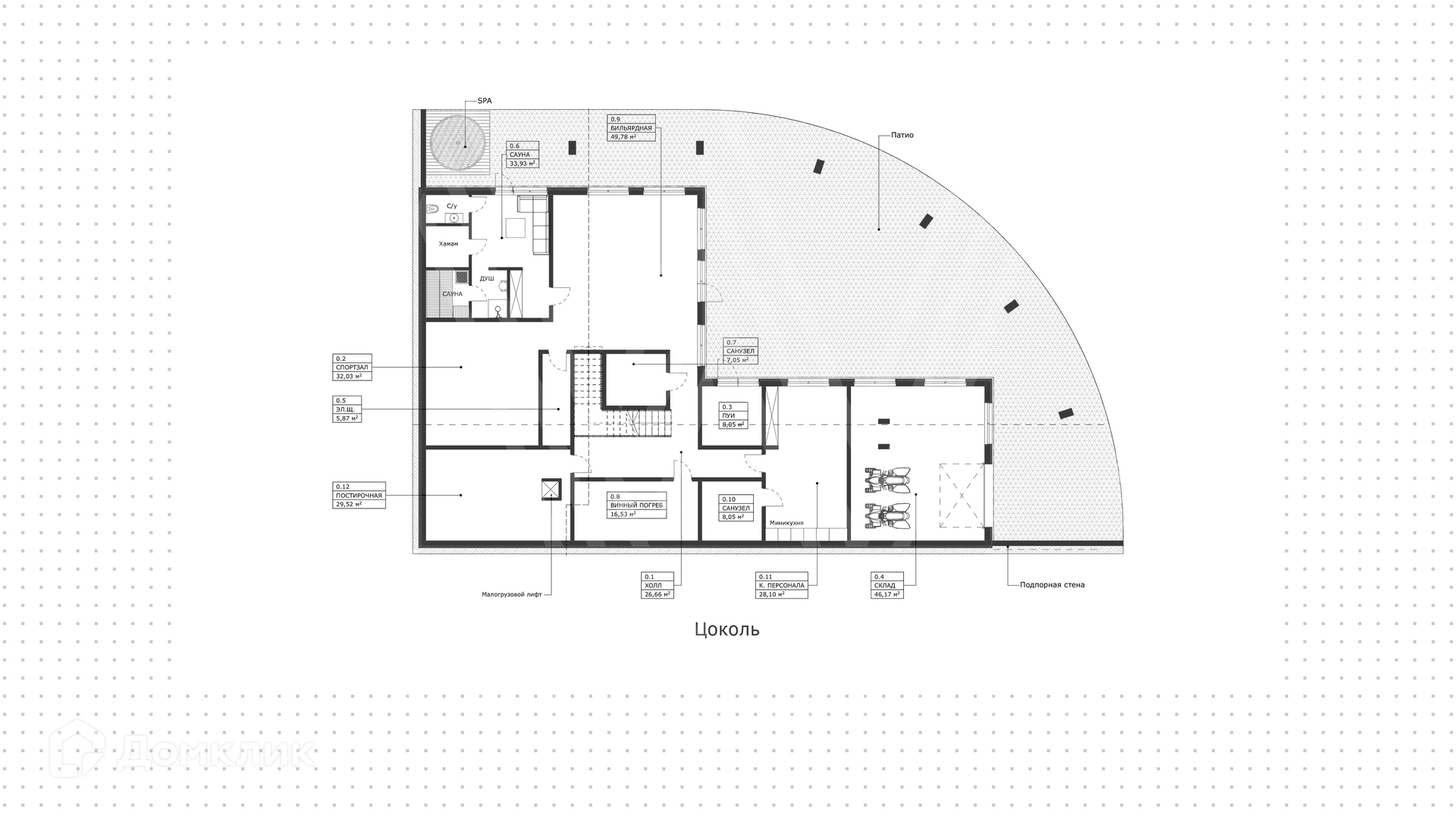 Цоколь: холл, спортзал, склад, сауна, 2 санузла, винный погреб, бильярдная, комната персонала, постирочная.