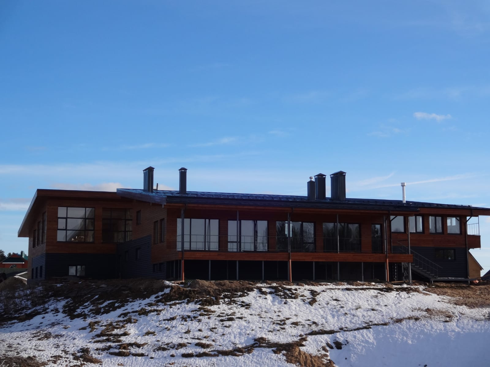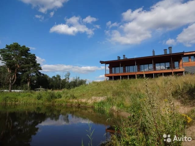 Основное здание расположено на берегу водоёма, зарыбленного и пригодного для купания. Панорамные окна от пола до потока вдоль всей стены с Великолепным видом на озеро и лес.