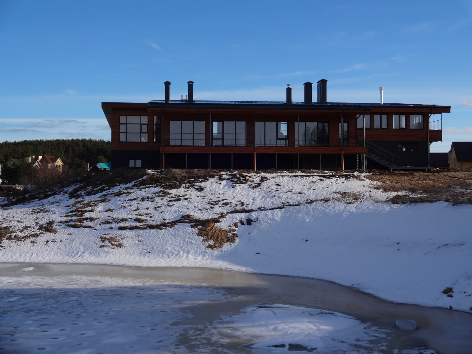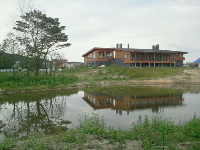 Основное здание расположено на берегу водоёма, зарыбленного и пригодного для купания. Панорамные окна от пола до потока вдоль всей стены с Великолепным видом на озеро и лес.