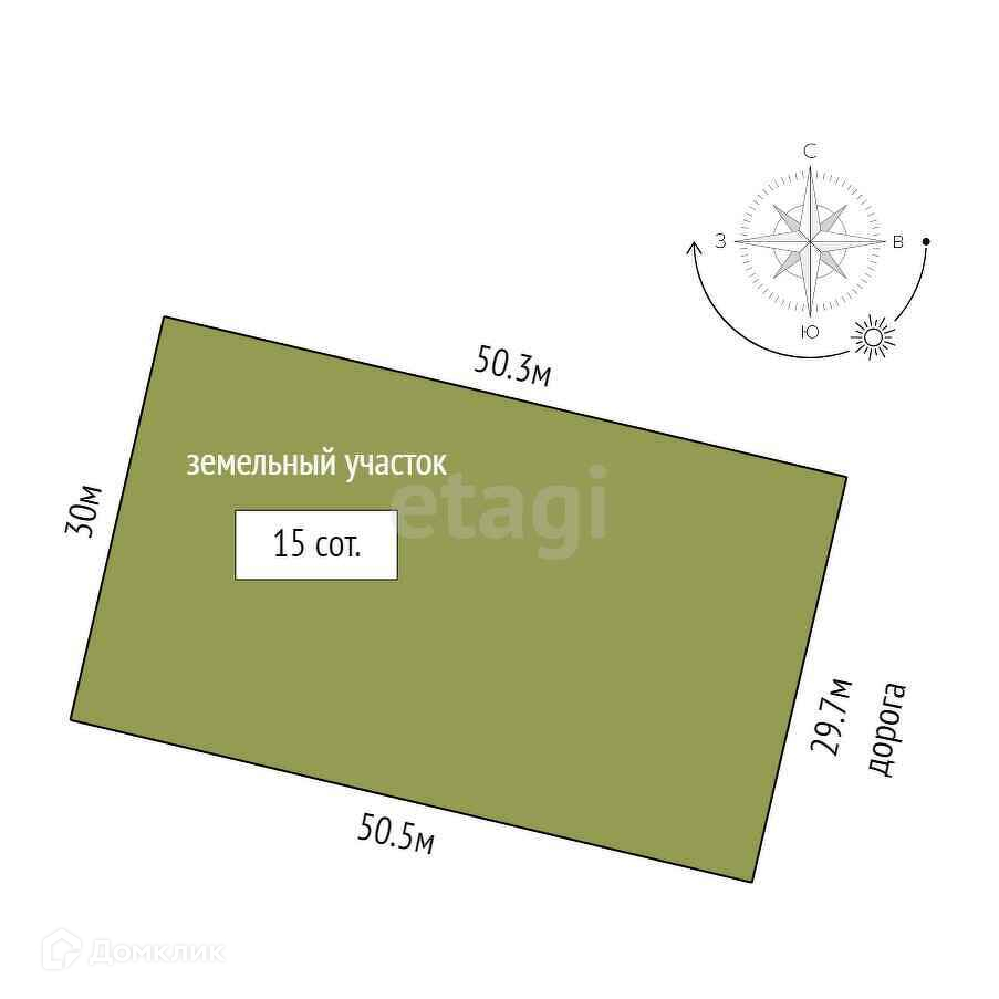 Площадь земельного участка 15 соток. Участок ровный. Не огорожен. Находится в 500 м от трассы.
