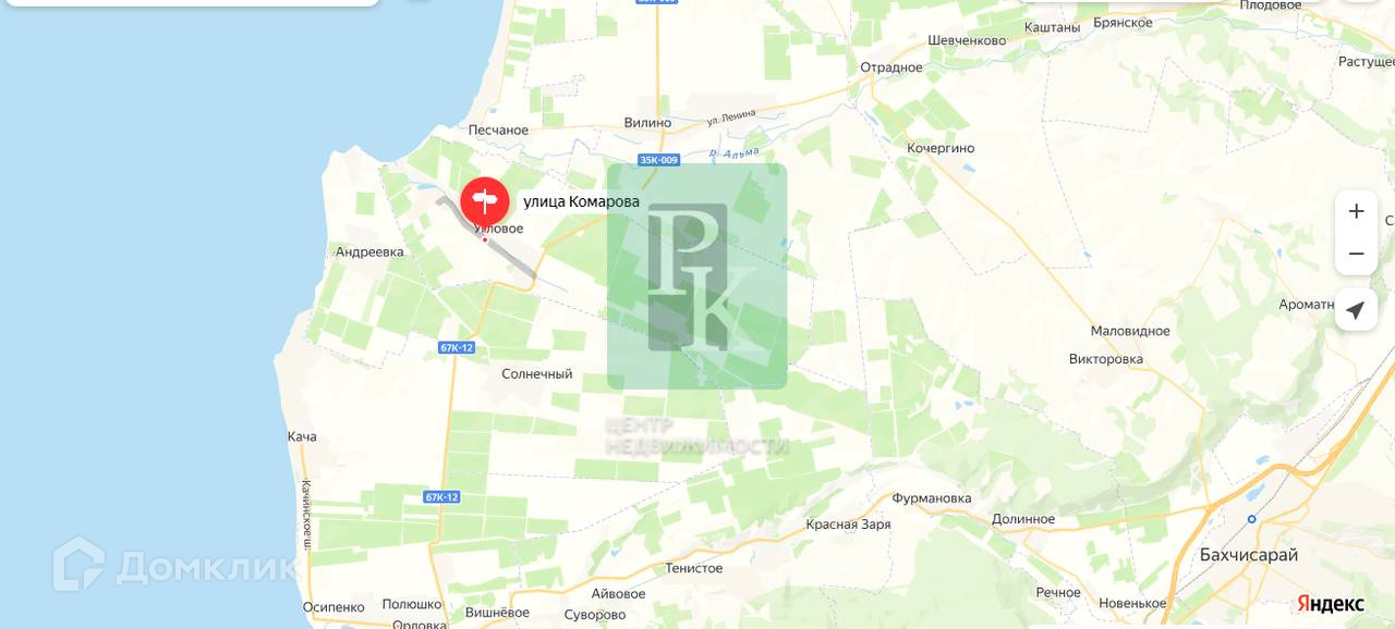 Дом 62,4 м² на участке 9,77 соток, одноэтажный. Расположен в Бахчисарайском районе, с. Угловое, улица Комарова. Коммуникации: электричество, водоснабжение, отопление, канализация, газоснабжение.
