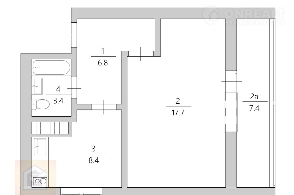 Общая площaдь — 36,4 м² + 7,4 м² пpocтopная лоджия, кухня — 8,4 м².