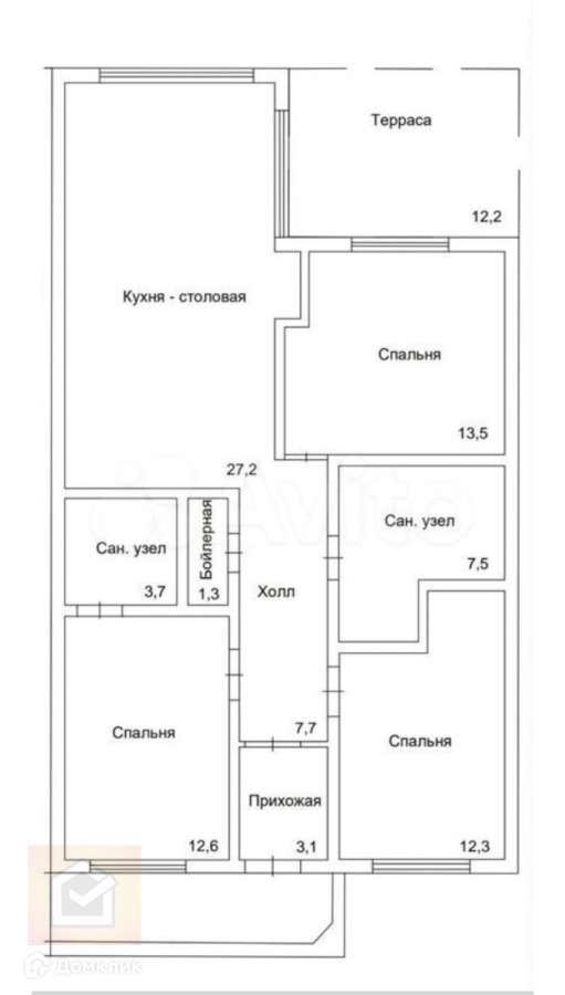В доме три спальни: в одной из которых отдельный сан.узел.