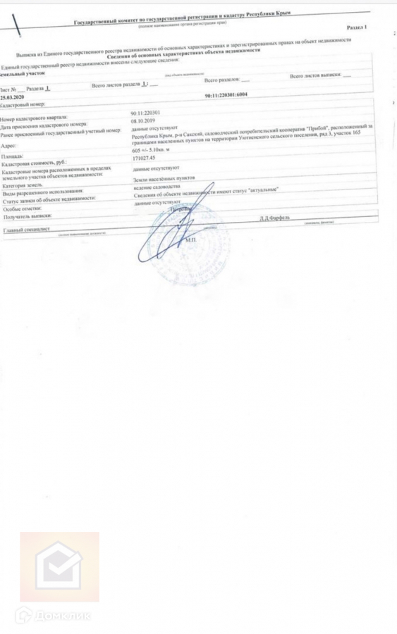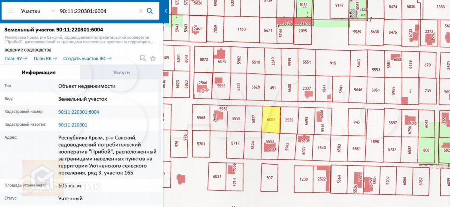 Участок 6,05 соток с. Уютное, СПК Прибой, ул. Виноградная 69, (ряд 3 участок 165) кадастровый номер 90:11:220301:6004, целевой взнос за электричество оплачен, но не заведен на участок, забор с одной стороны.