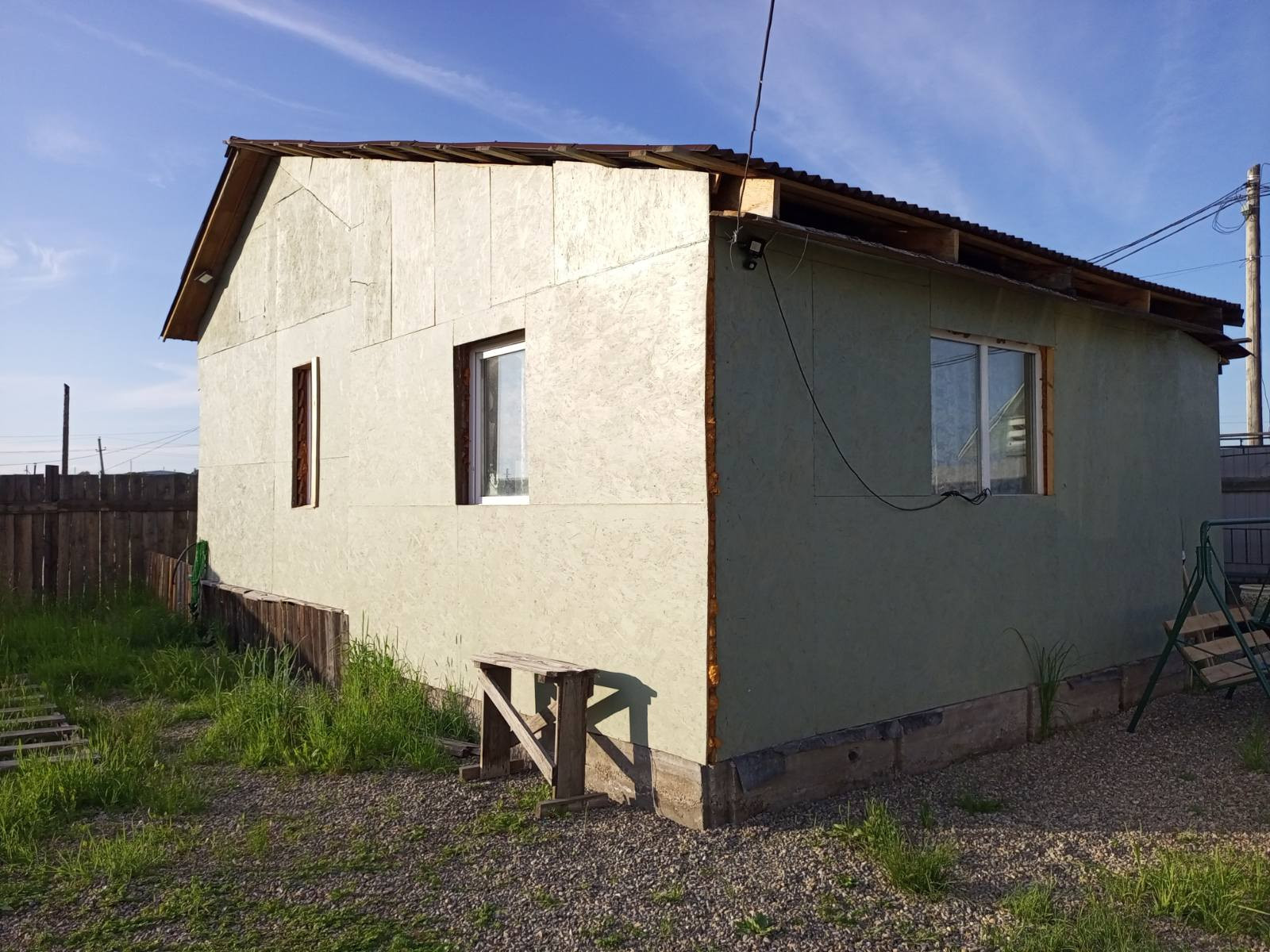 небольшой дом. 38 кв.м. материал стен смешанный, часть газоблок. часть сенгвич панель. дом стоит на бетонном фундаменте, скважина 12 м, септик 3 куба, свет подключен, вода заведена в дом, отопление электрическое, участок ровный, на участке сарай и беседка. забор по периметру деревянный, лицевая сторона металлопрофиль. дом обшит ОСБ, с лицевой стороны не ного не дообшит. хорошая цена. Подходит под любой вид расчета .