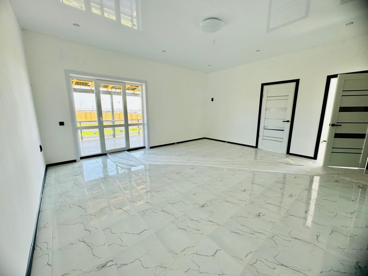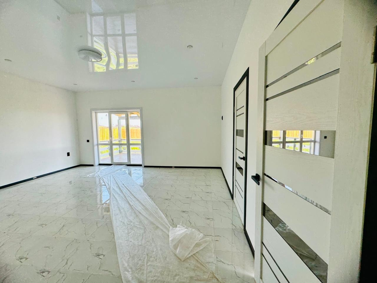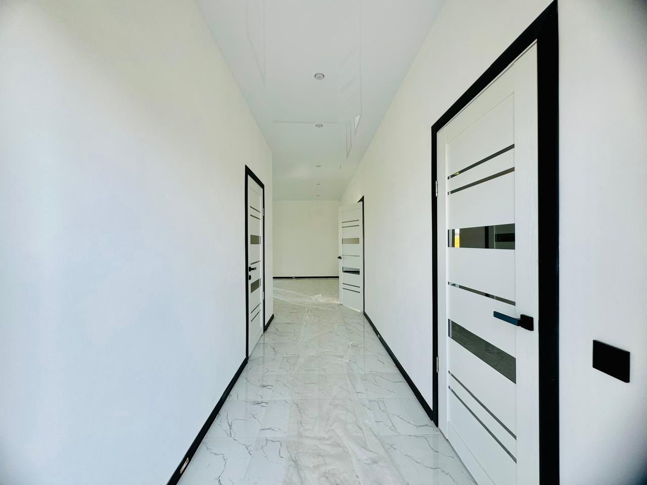 Натяжные глянцевые потолки, точечные светильники. Яркое освещение, даже в пасмурные дни в доме светло и уютно! Установлена сантехника: унитаз, душевая кабина, раковина.