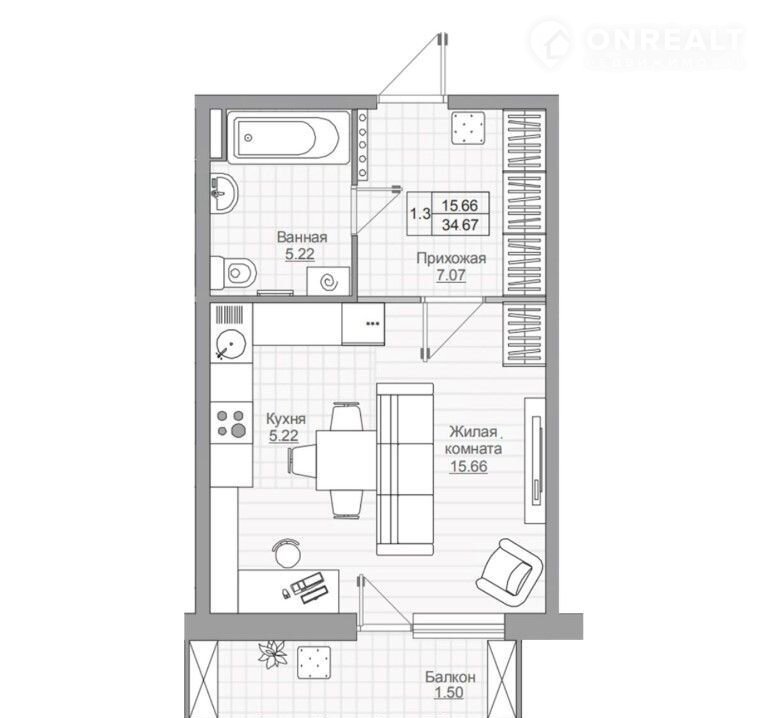 Общая площадь 34.7 м2