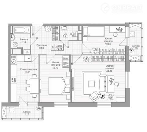 Общая площадь 75.7 м2