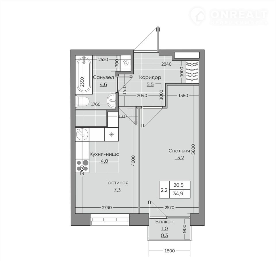 Общая площадь 34.9 м2