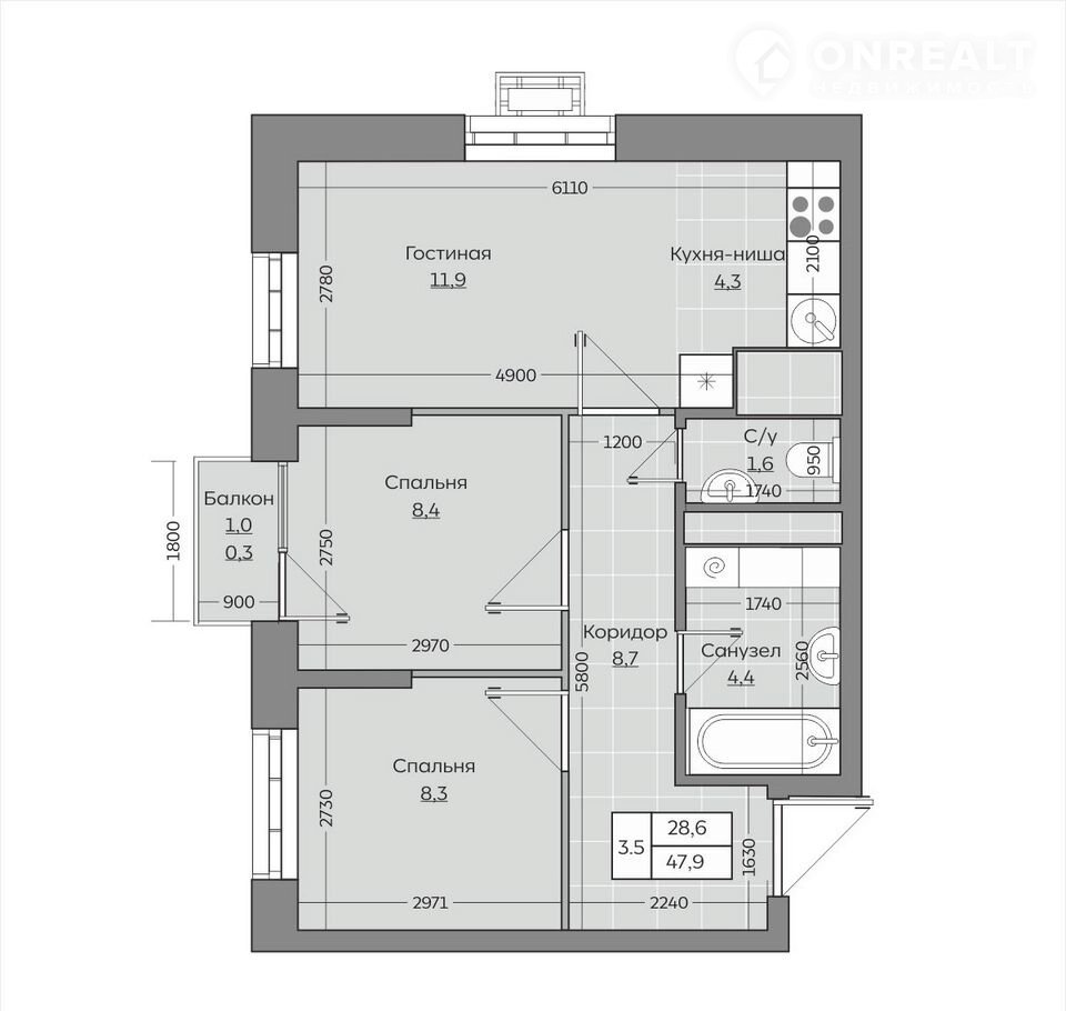 Общая площадь 46.9 м2