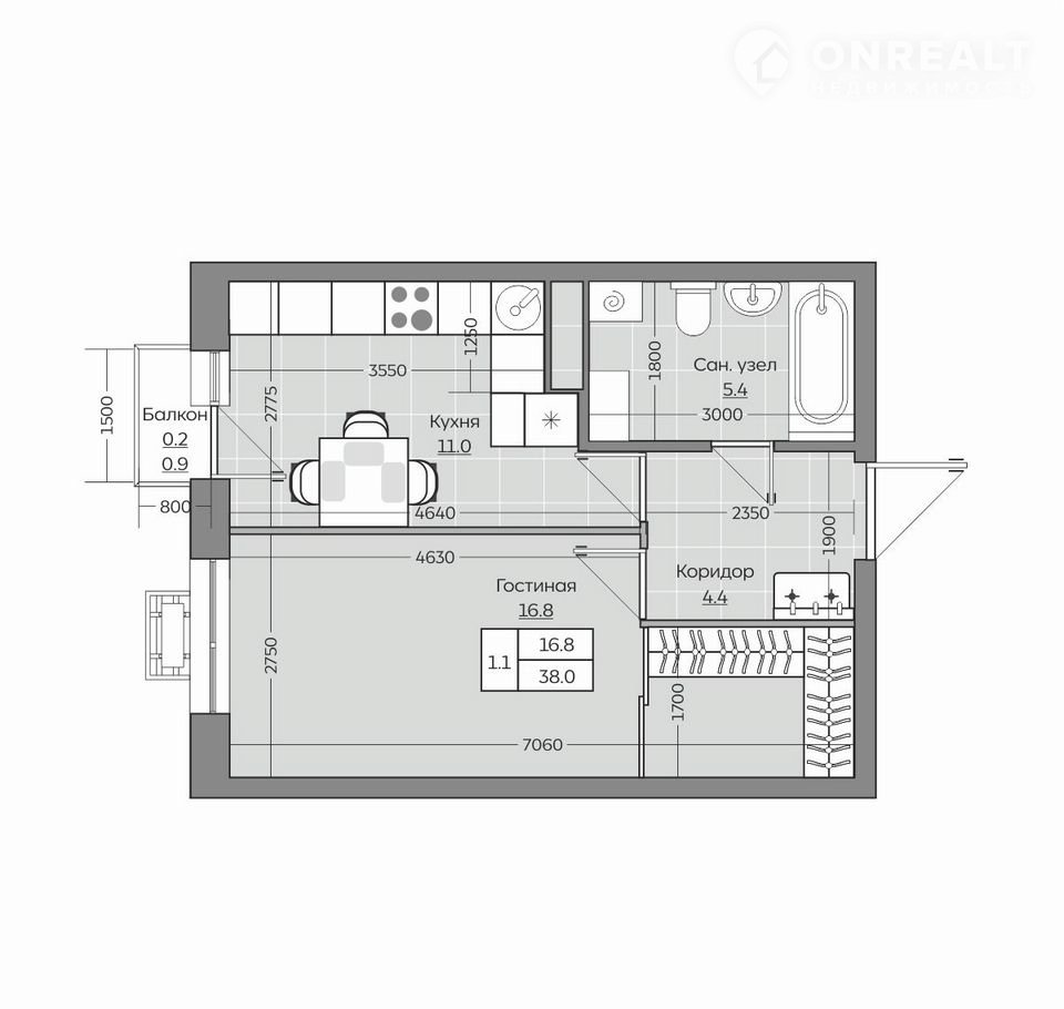 Общая площадь 38 м2