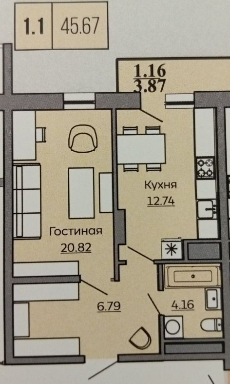 Общая площадь 45.67 м2