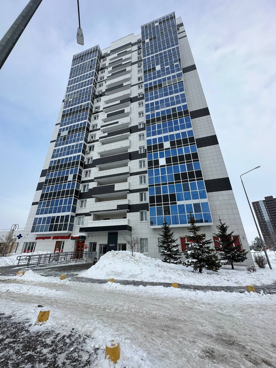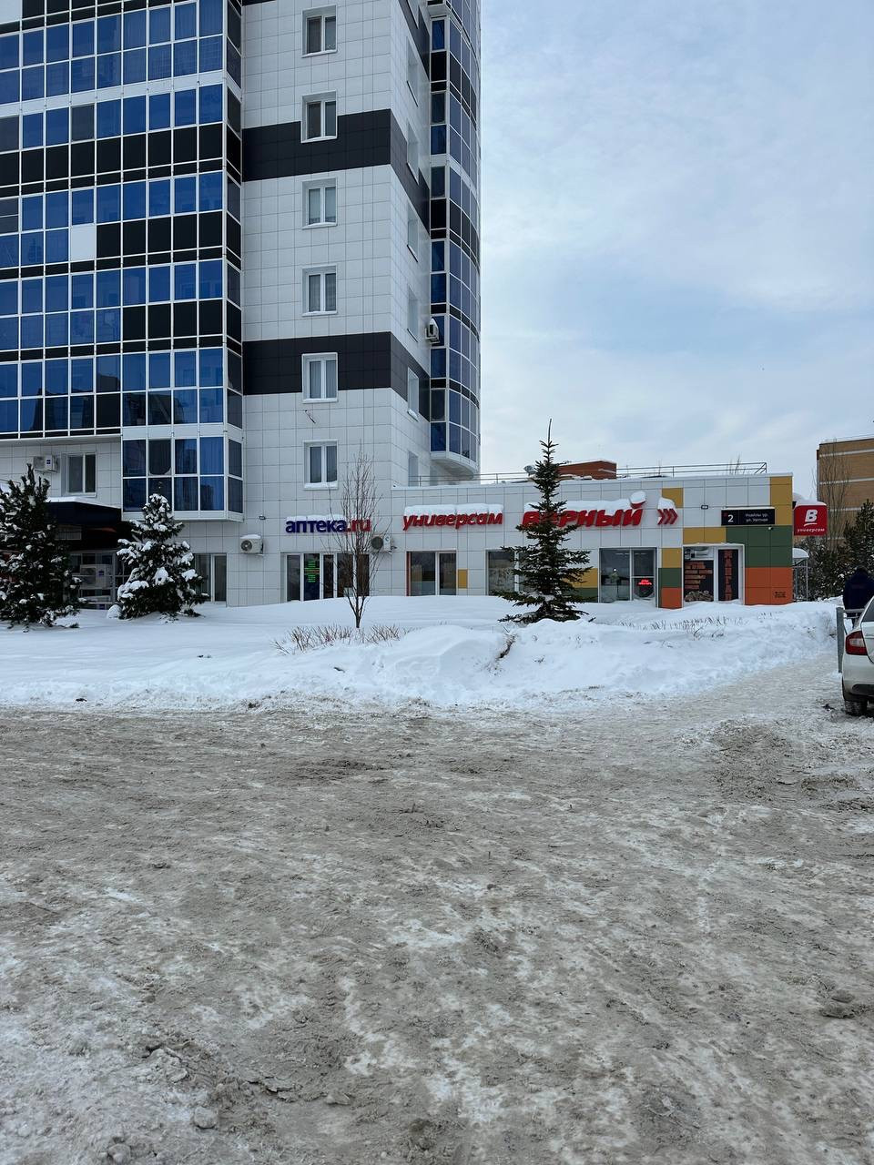 -На первом этаже дома магазин Верный, Пекарня, Аптека, ozon.Через дорогу магазин Пятёрочка