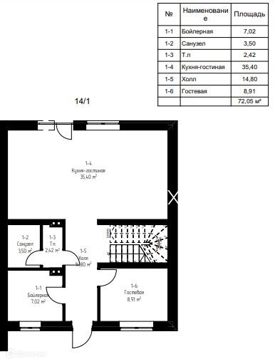 1 этаж: Входная группа, холл, просторная кухня- гостиная, гостевая комната, санузел, отдельная котельная комната;