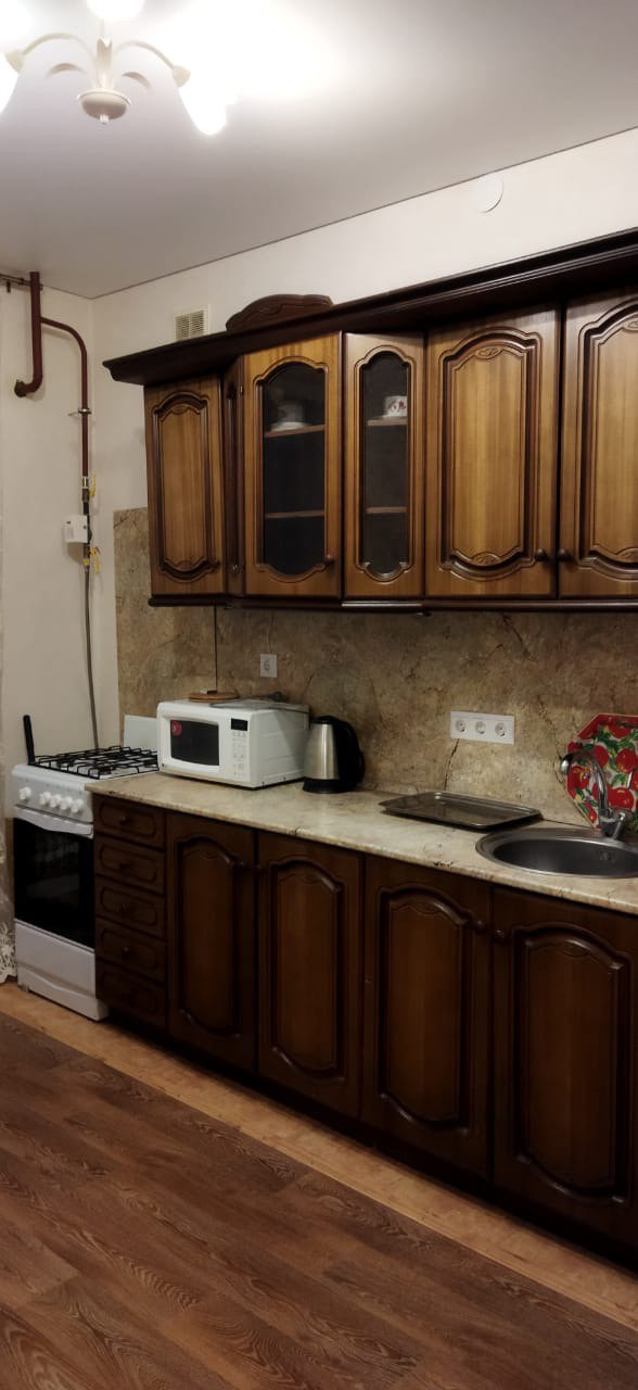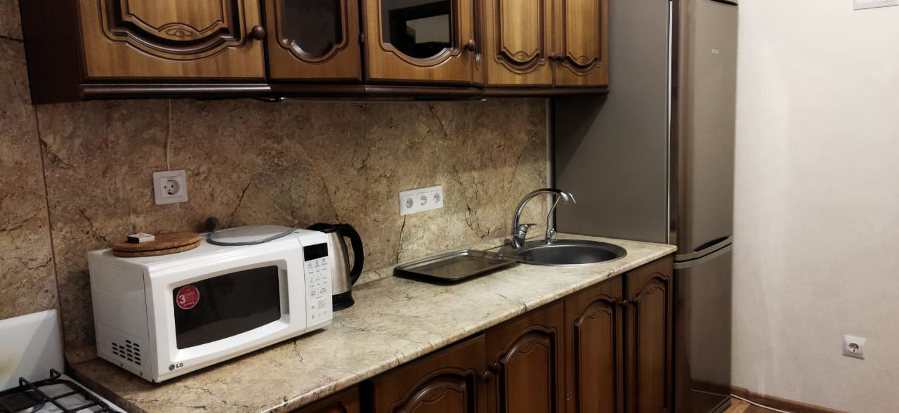 Полностью оборудованная кухня: холодильник, плита с 4 конфорками, духовка, микроволновка, телевизор, небольшой набор посуды.