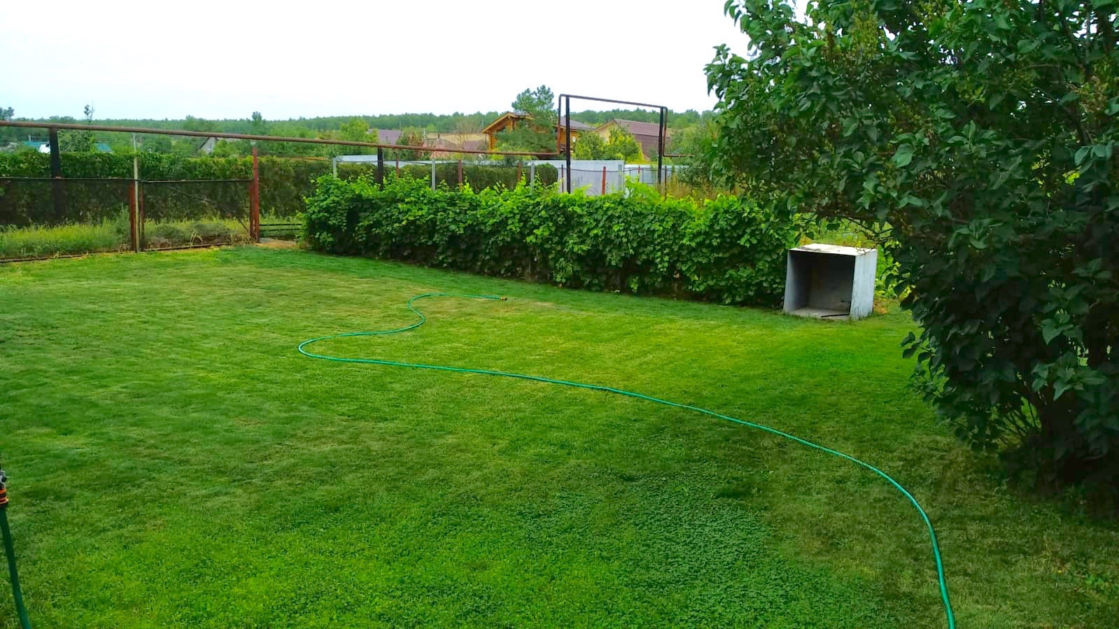 Участок ровный, прямоугольной формы, по периметру огорожен сеткой-рабицей. На участке, помимо дома, имеется летняя кухня с погребом, гараж под катер, сарай. Участок засажен газоном.