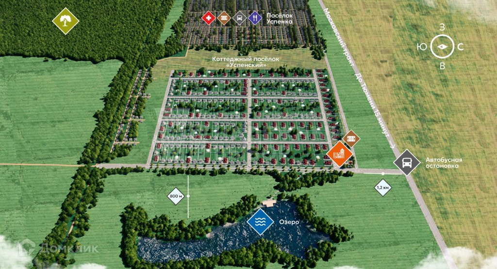 В вашем распоряжении, всего в 5 минутах езды дер. Успенка, где расположены школа, детский сад, магазины, аптека, отделение сбербанка, в пешей доступности остановка общественного транспорта.           Участок правильной формы, что позволит построить на нем дом своей мечты. Сам участок уже подключен к электрическим сетям мощностью 10-15 кВт, что дает возможность незамедлительно приступить к строительству дома, а так же в поселке проведен газ.