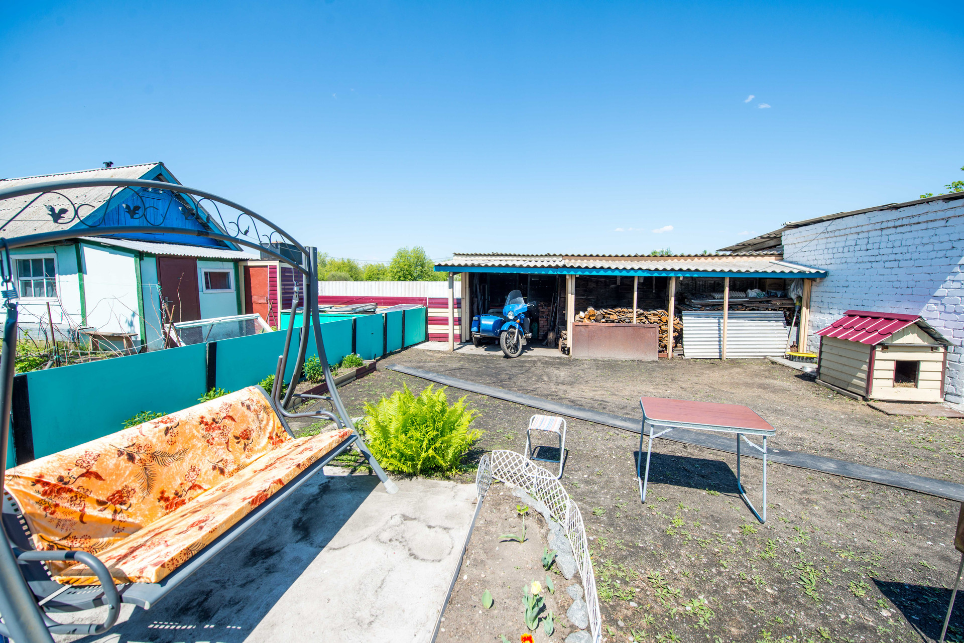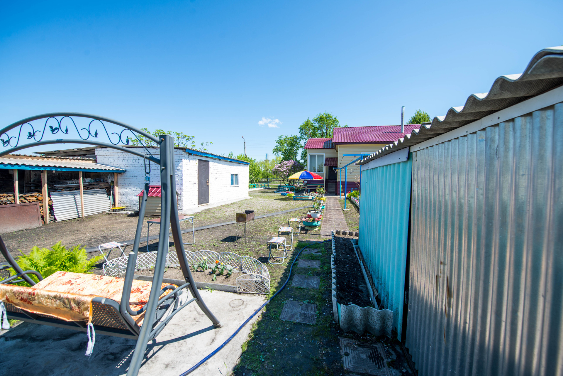 Расположен на участке 16 соток. Состояние хорошее. Скважина. Во дворе расположены: баня, два гаража, другие дворовые постройки. Произрастают плодово-ягодные насаждения.