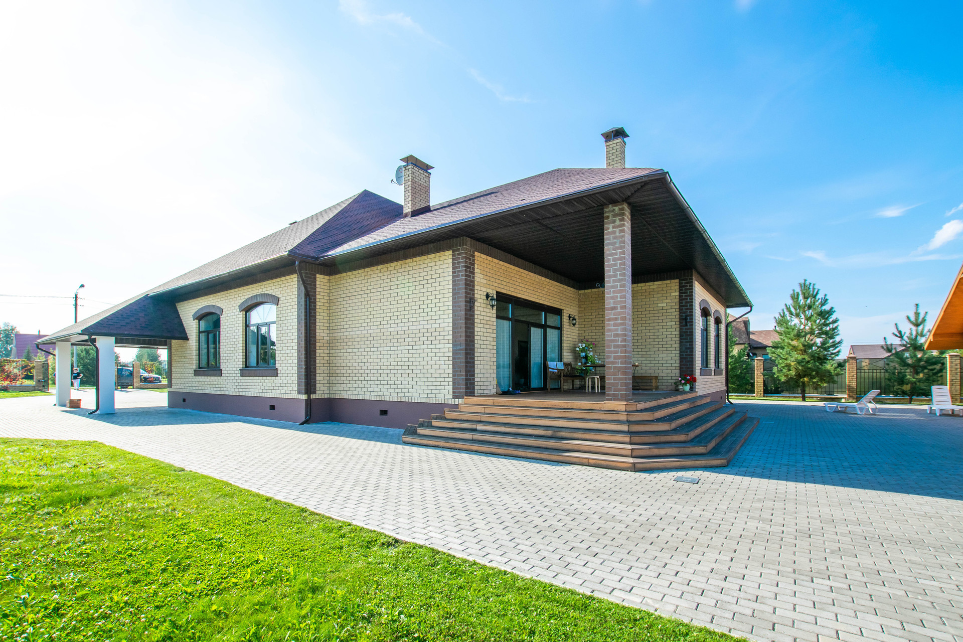 2-этажный  полностью кирпичный коттедж  построен по индивидуальному  проекту.  Современная отделка, удобная функциональная планировка:  просторная гостиная с камином, кухня-столовая с выходом в сад, бильярдная, 5 уютных  спален.