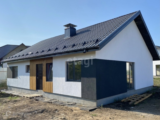 Дом на этапе строительства планируется сдача сентябрь 2022, дом построен, утеплитель 100 мм, на фасаде выполнена декоративная штукатурка шуба с отделкой планкеном лиственницы. В доме современные большие панорамные окна.