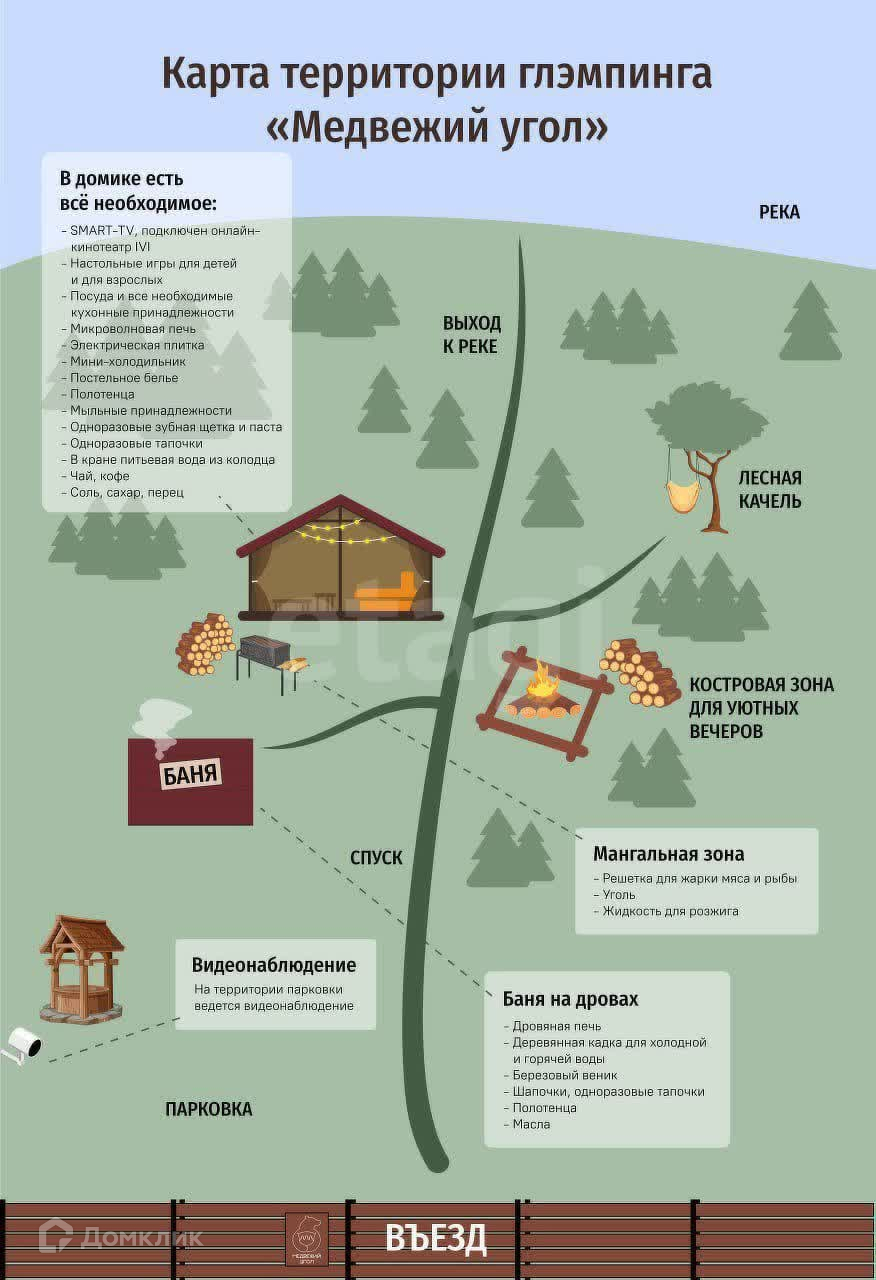 Не упустите шанс стать владельцем этого успешного глэмпинга и наслаждаться стабильным доходом, не выходя из дома! Отличное месторасположение на берегу реки и все необходимые условия для комфортного отдыха делают это предложение поистине уникальным. Звоните прямо сейчас, чтобы узнать подробности и организовать просмотр!