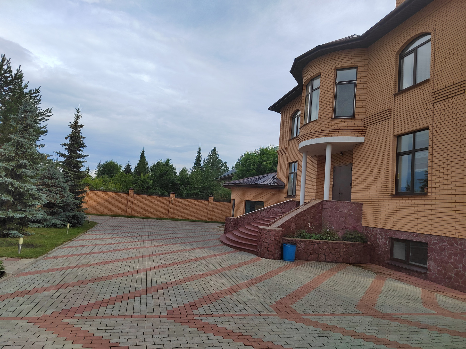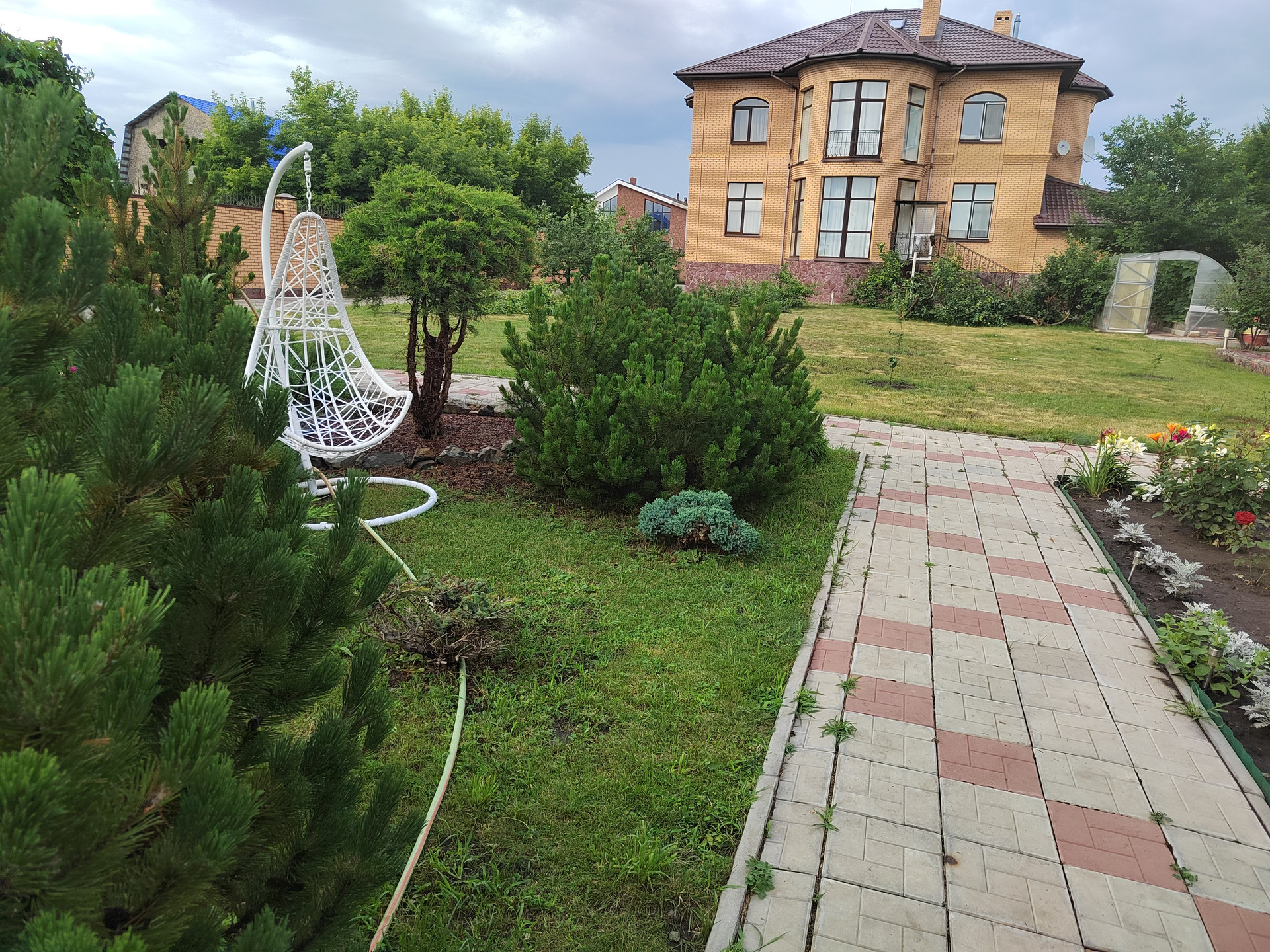 Территория участка полностью благоустроена: пешеходная зона вымощена тротуарной плиткой, в ландшафтном дизайне предпочтение отдано хвойным посадкам, плодоносящим деревьям и кустарникам.
