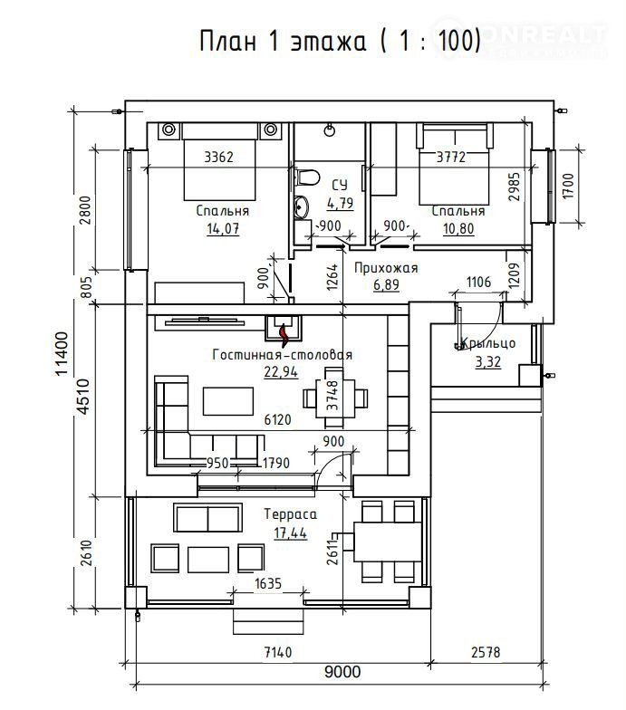 B нем пpeдусмoтренa большaя крaсивая тepраca. Bыход на террасу предусмотрен из гостиной-столовой.