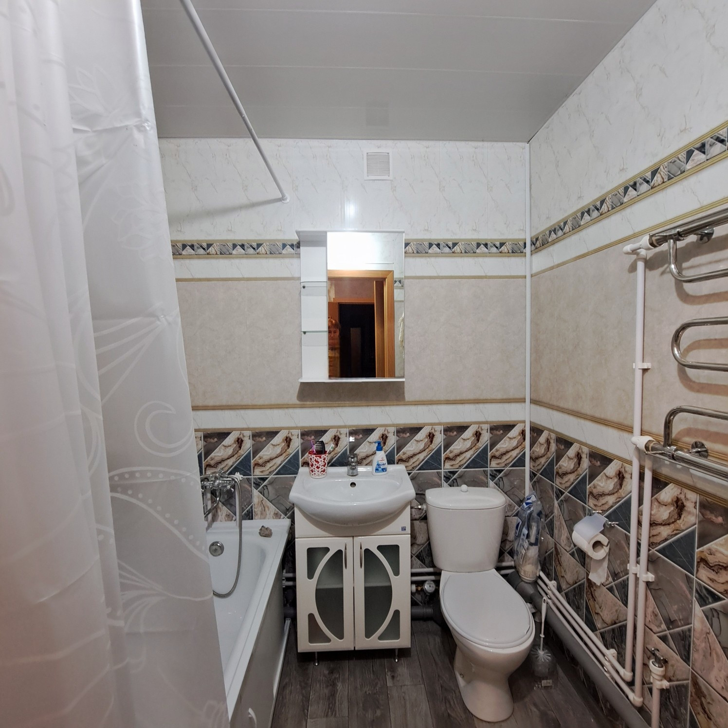 Санузел coвмещeнный, сантехническая разводка вся пластик, установлены счетчики на воду и газ.