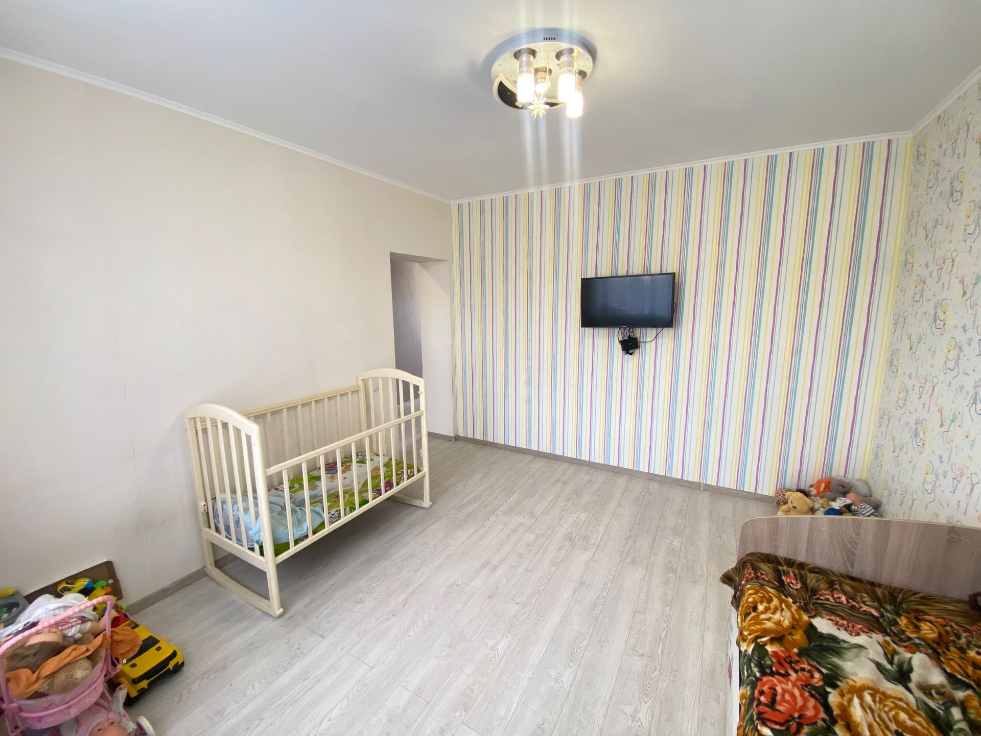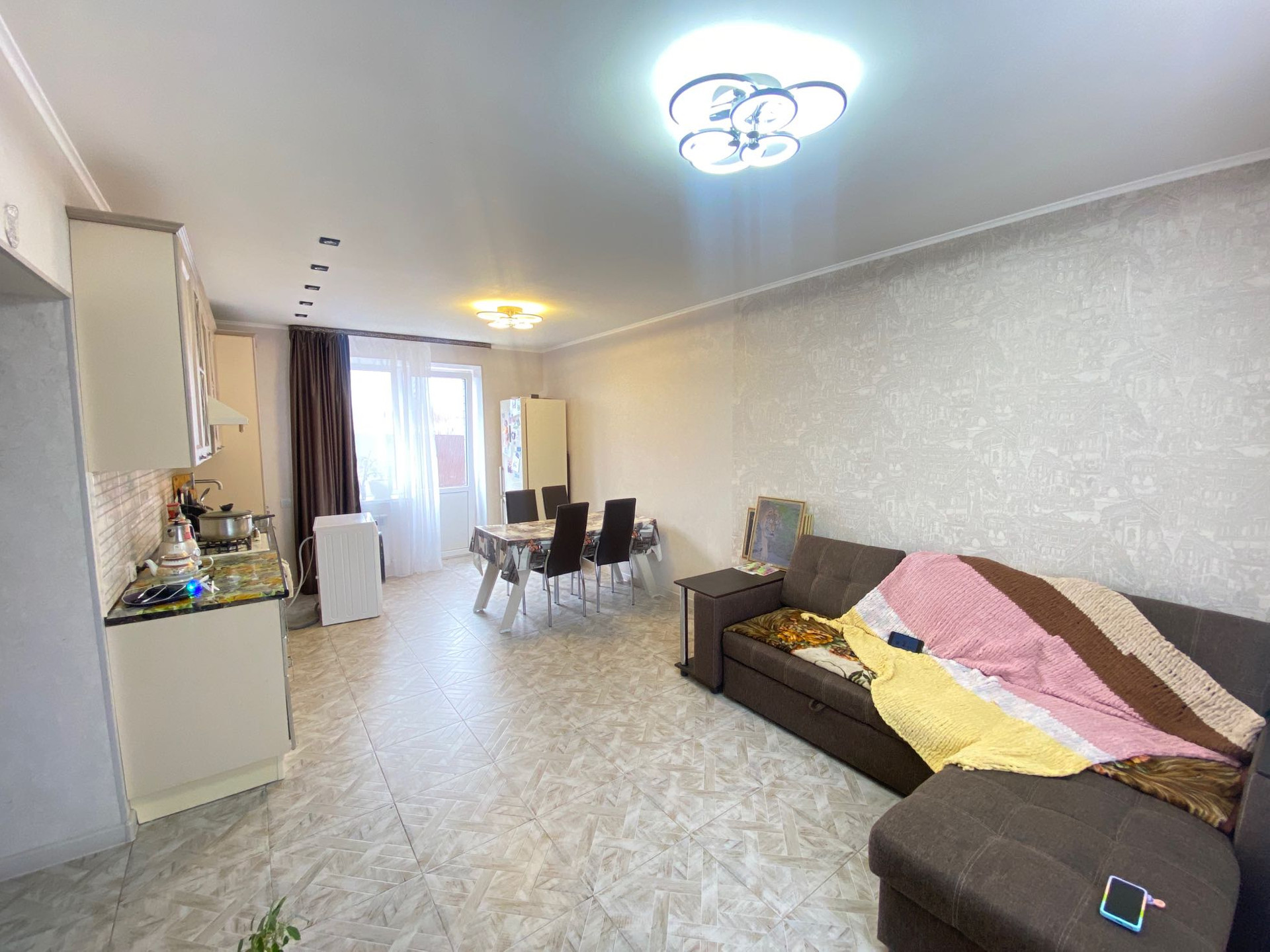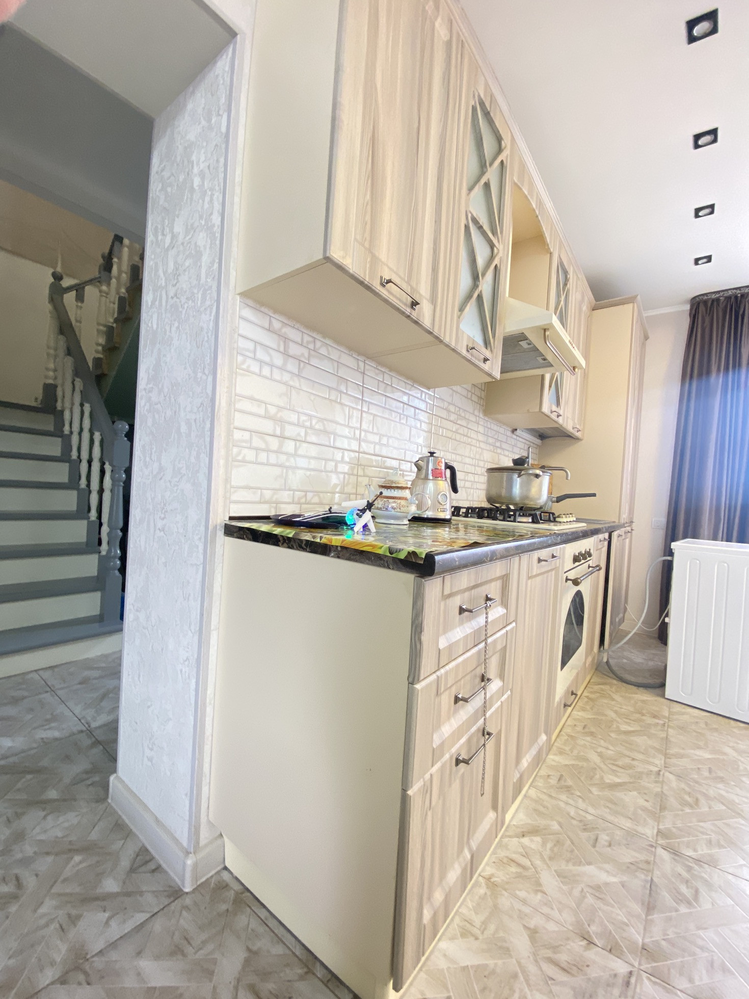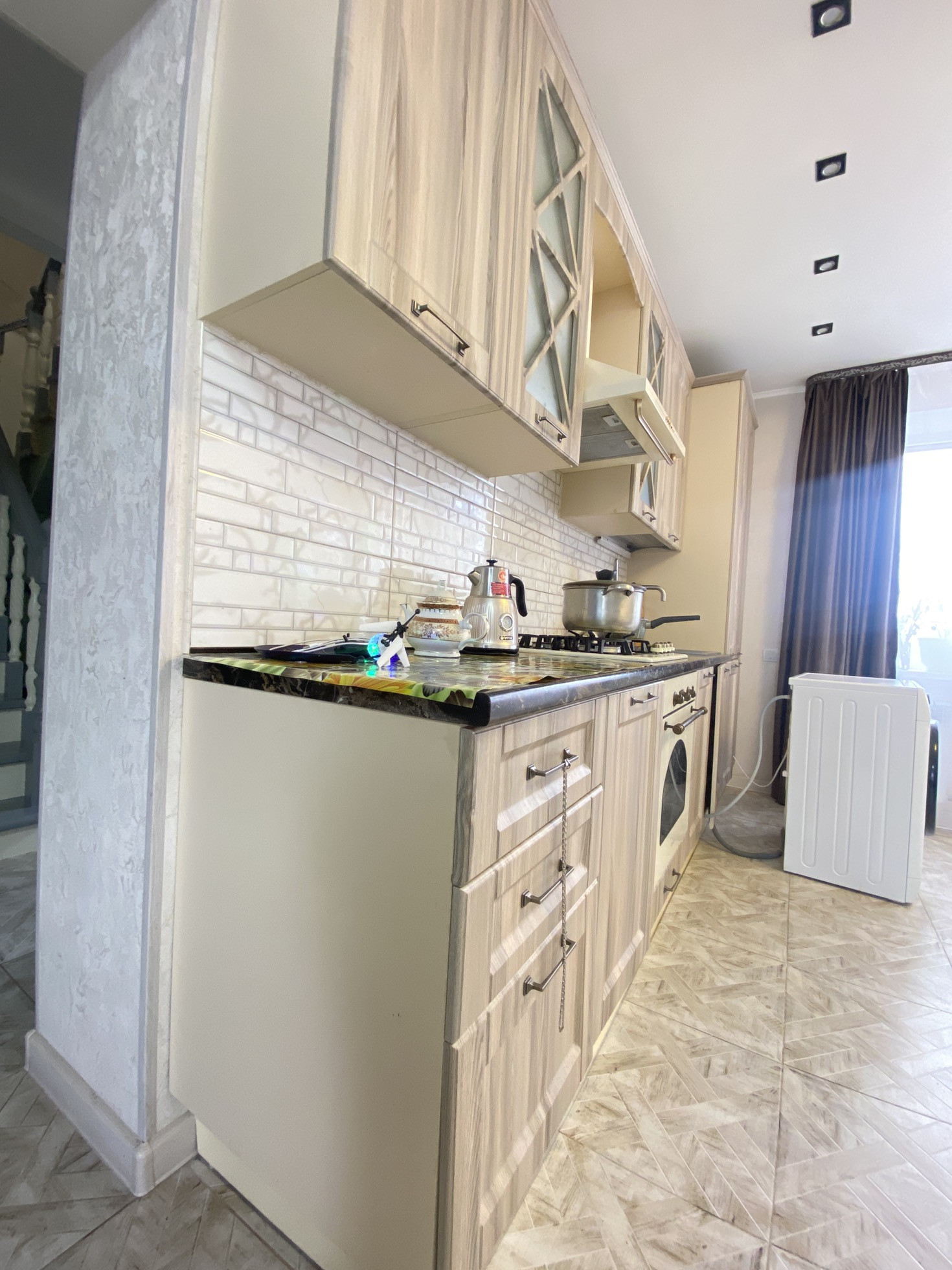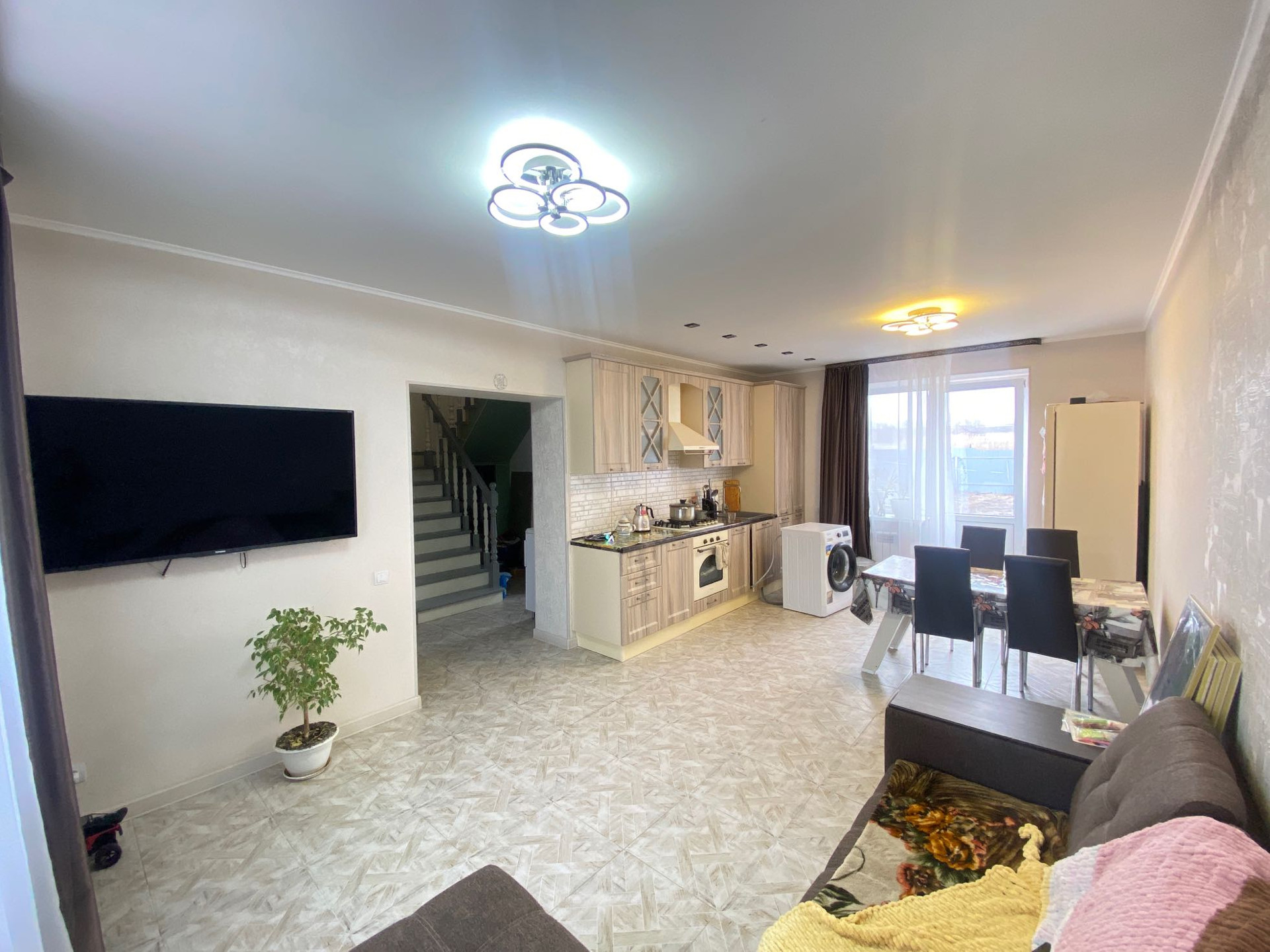 На первом этаже трёхконтурный тёплый пол. Выложена плитка на полу. Стены выровнены под маячки и оклеены обои, натяжные потолки.