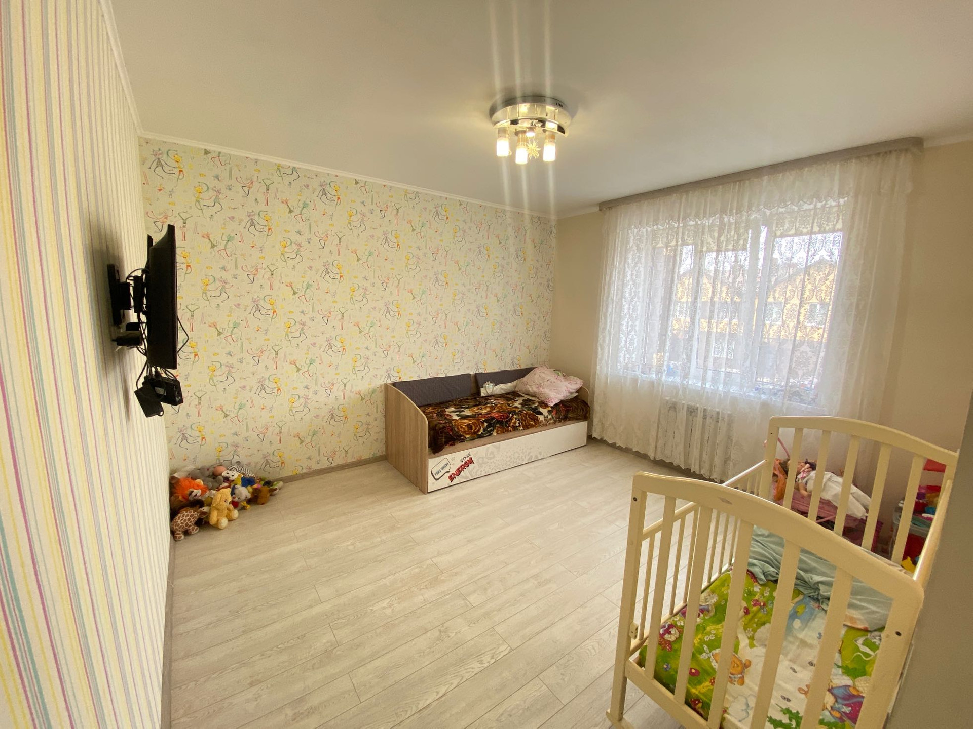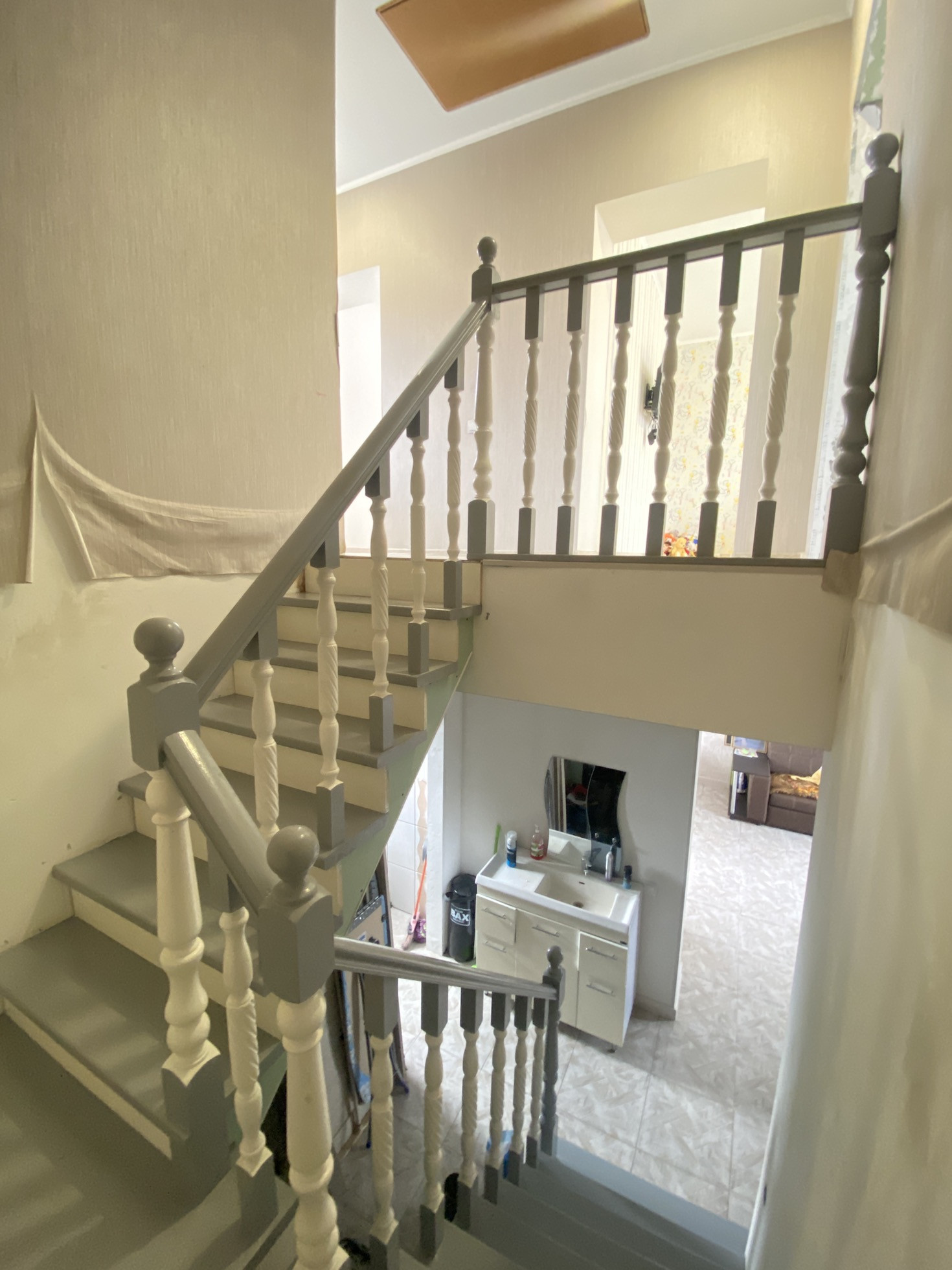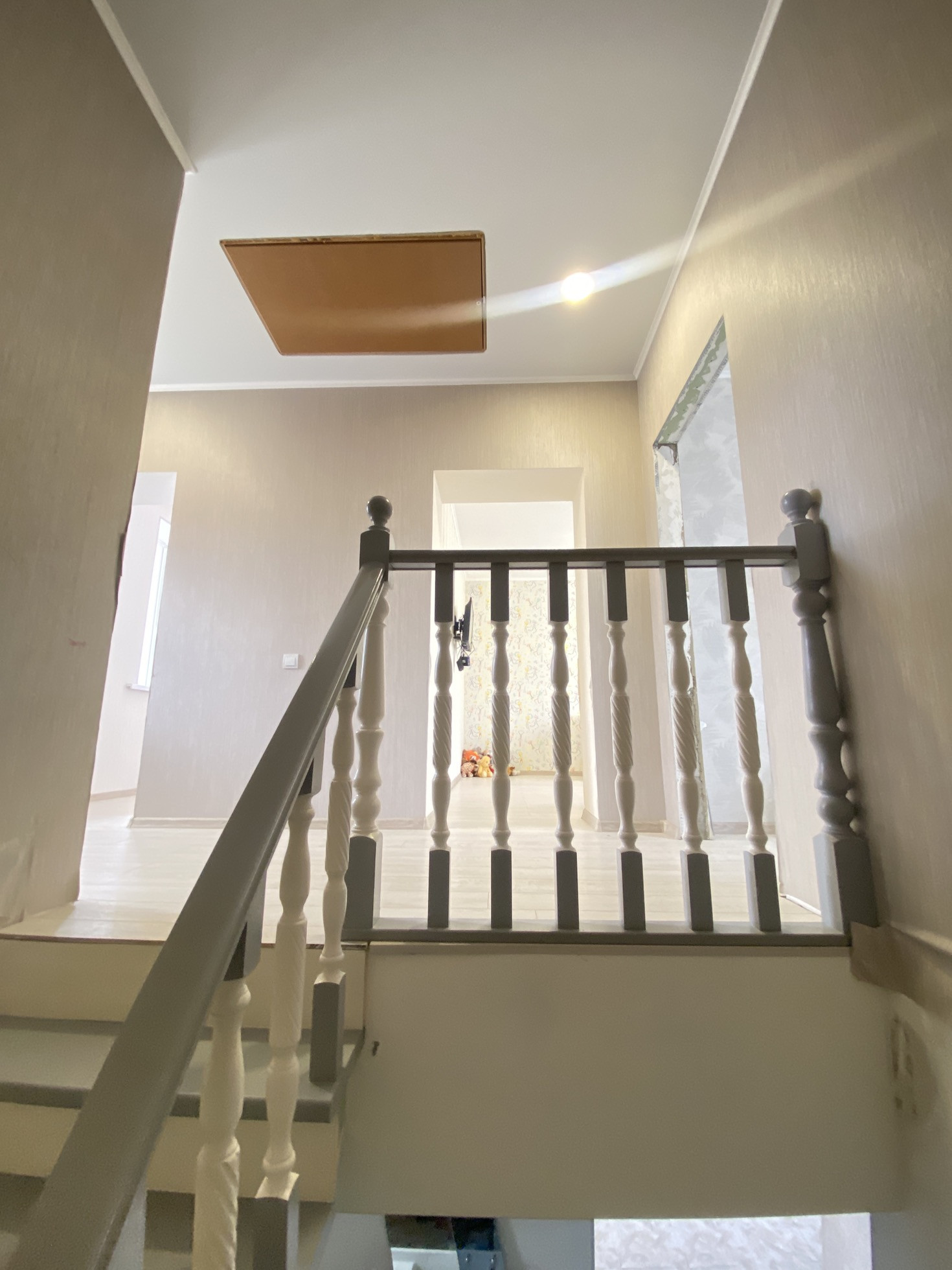 На втором этаже на полу стяжка и дорогой качественный ламинат, на стенах обои, натяжные потолки.
