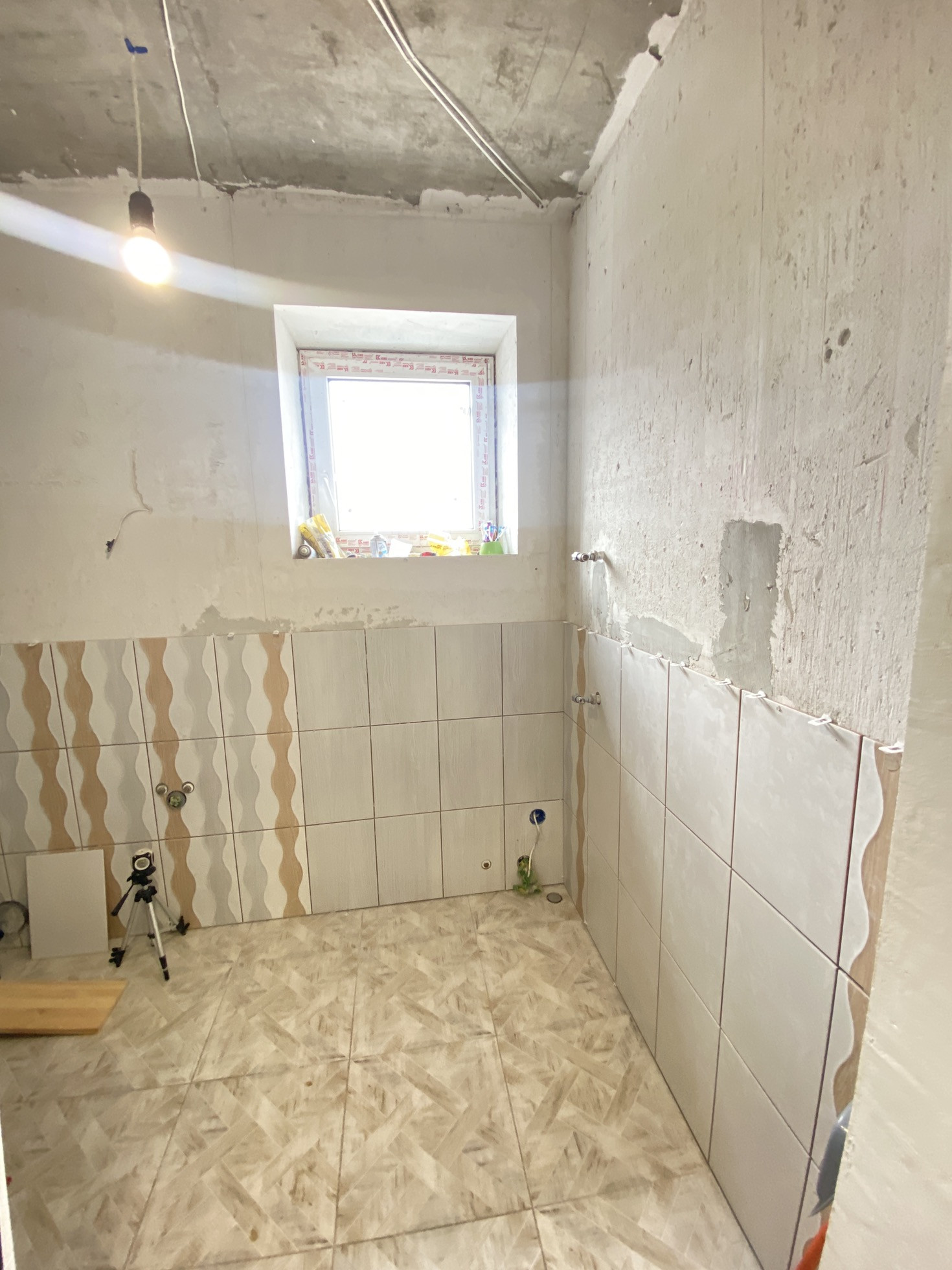 В доме два санузла. На первом и на втором этаже. Плитка куплена в санузлы, нужно доложить ее и установить натяжной потолок с сантехникой.