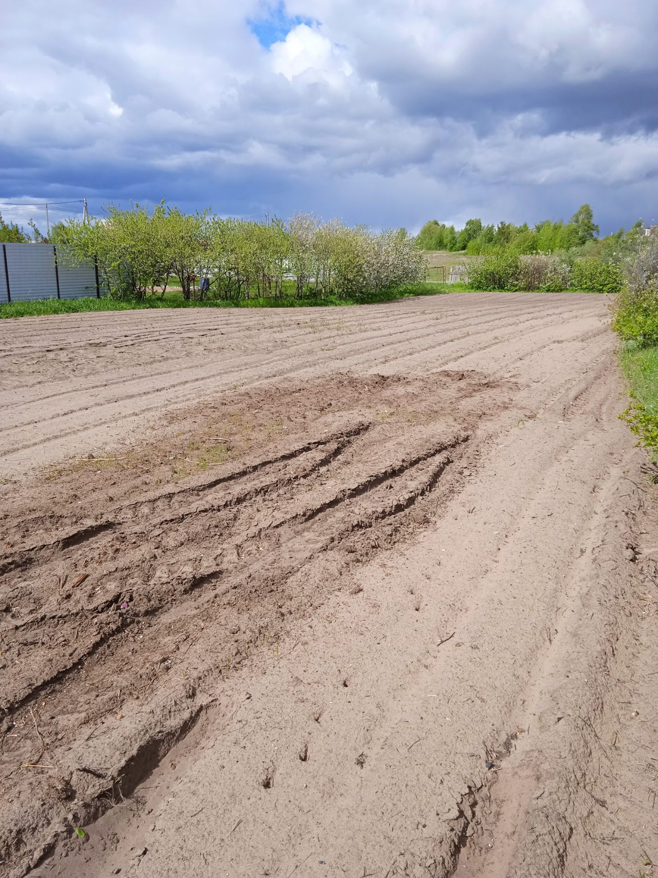 На участке вдоль забора плодовые деревья.