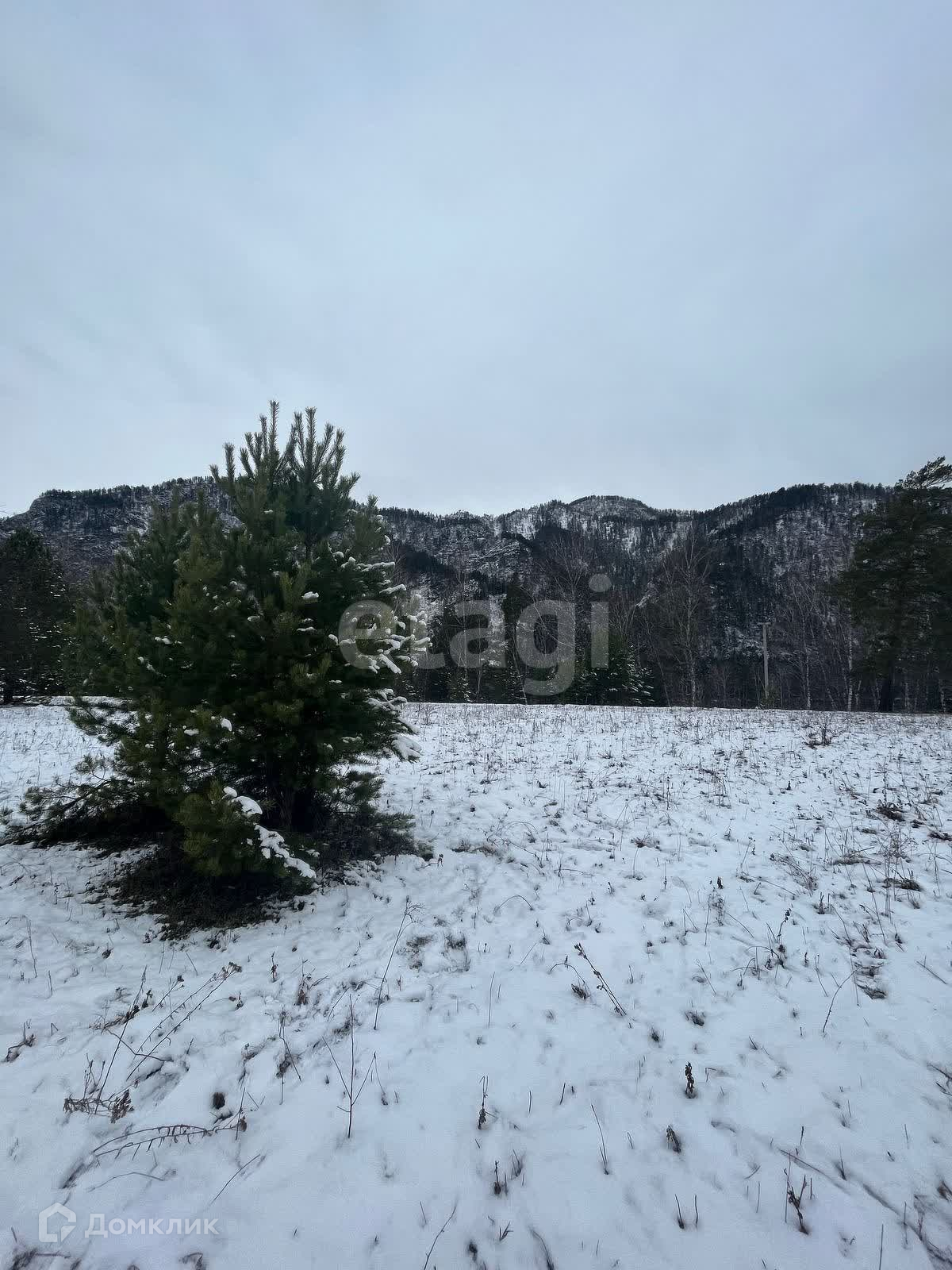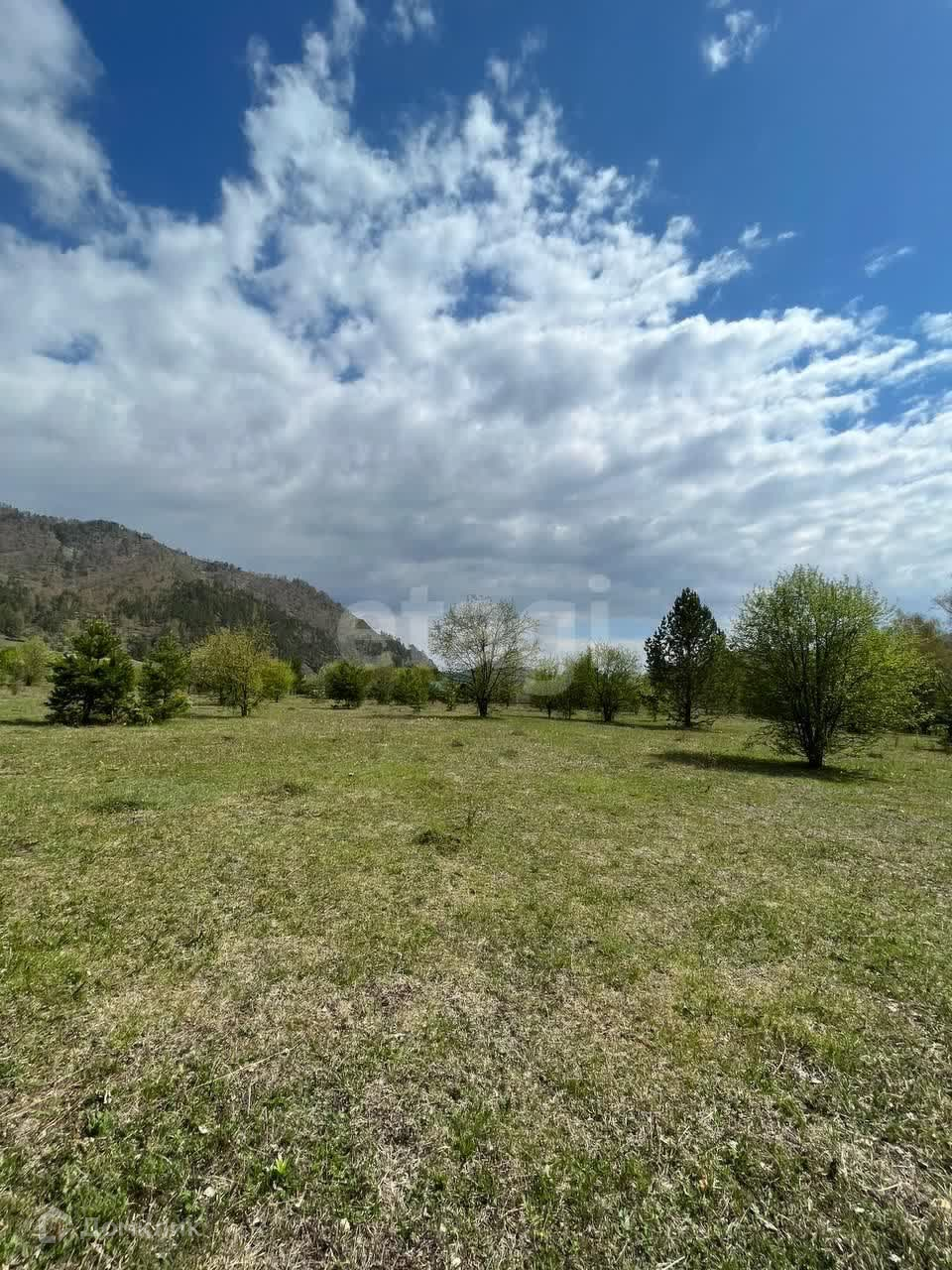 Красивый вид на горы с одной стороны, с другой - на реку. На участке имеются деревья: ели, березы.