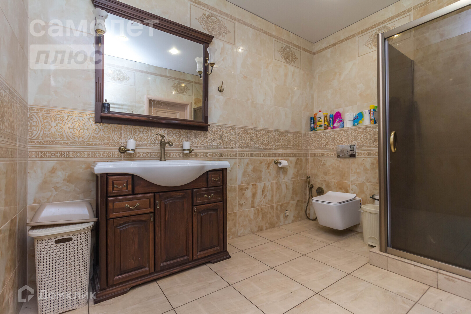 На первом этаже теплый пол по всей площади, керамогранит, просторная гостевая, кухня со встроенной мебелью из массива дуба, 2-мя комнатами и большим санузлом.