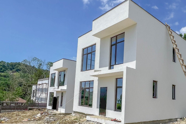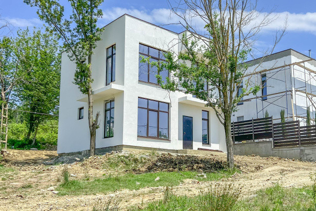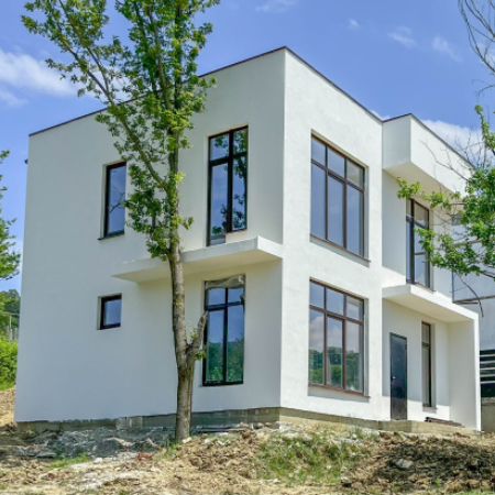 Дом построен полностью: три балкона,  полускатная крыша с небольшим склоном, можно сделать эксплуатируемую. Окна с защитой от ультрафиолета.
