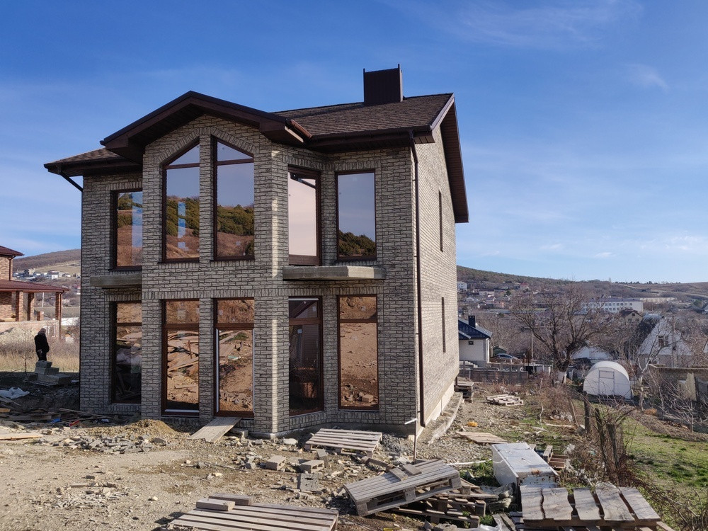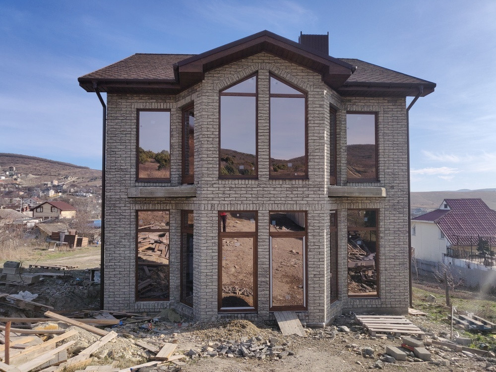 Стены - блок, утеплитель и полноразмерный качественный керамический кирпич, что придает дому свою красоту, выделяясь на общем фоне.