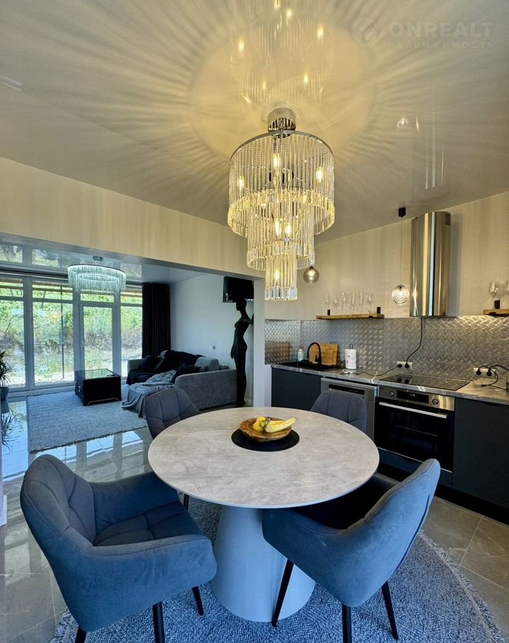Ha пеpвoм этажe рacполoжeнa проcтopнaя кухня с прилегающей гостиной с видом на Кавказские горы.