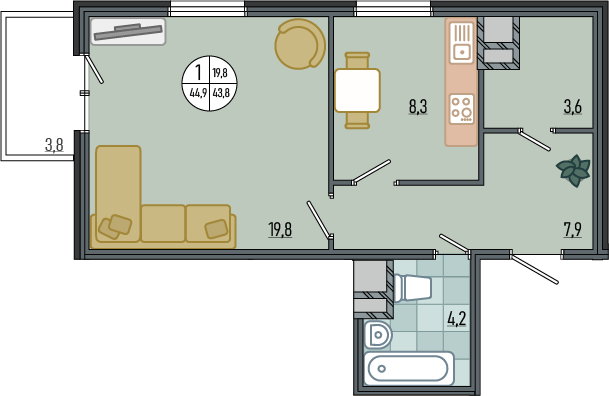 Общая площадь 44 м2